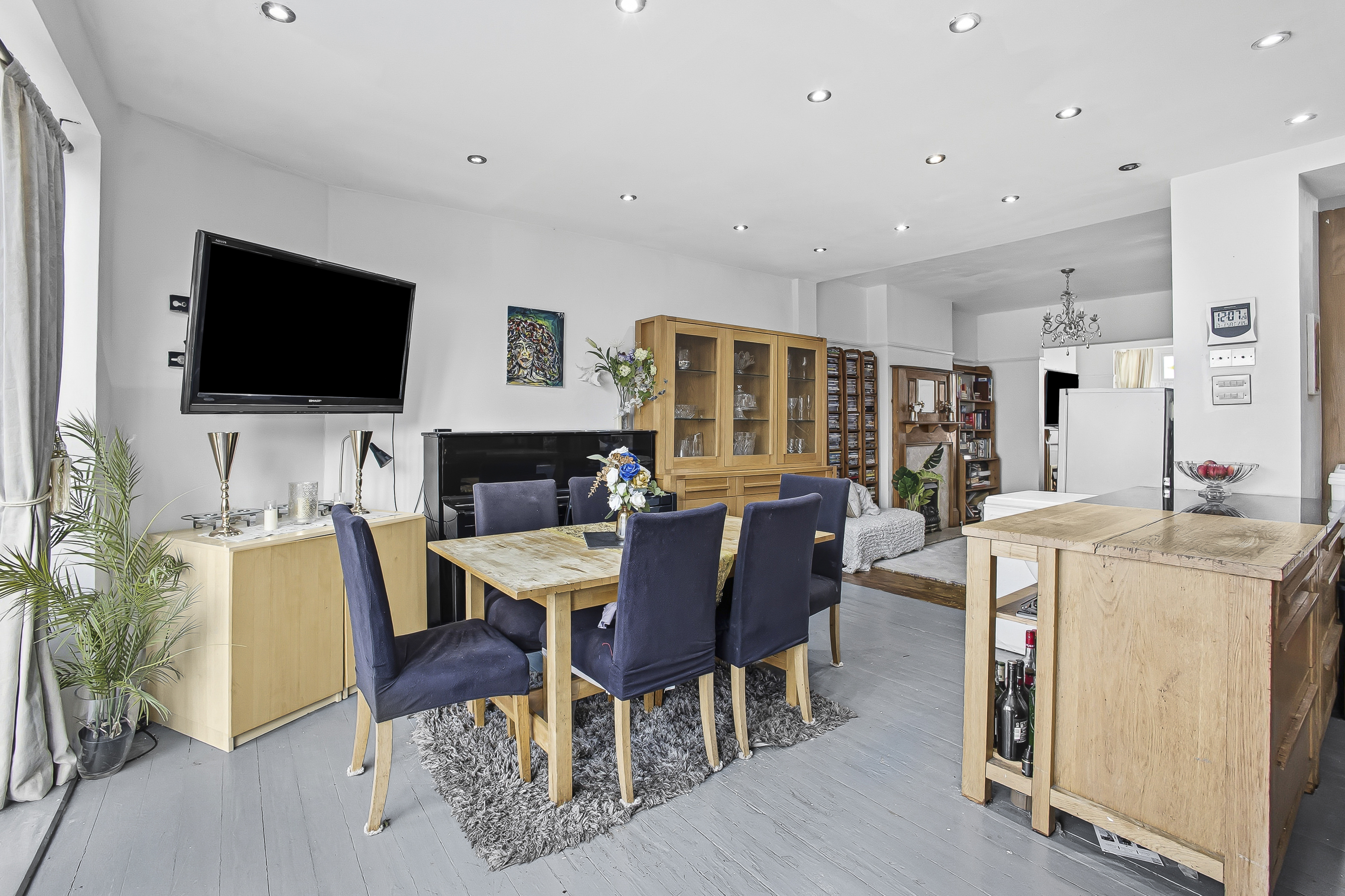 To the rear of the property is the impressive kitchen and dining room. This large open area stretches across the back of the house and provides plenty of space for cooking, dining and entertaining. The layout allows for a natural dining area and social seating space, making it ideal for family life or hosting guests. Doors lead out to the garden, creating a nice indoor outdoor flow.