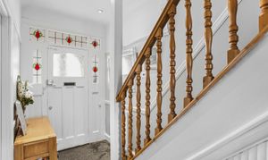 The property opens into a welcoming entrance hallway with stairs leading to the upper floors. At the front of the home sits a bright lounge featuring a bay window that brings in plenty of natural light, creating a comfortable space to relax.
