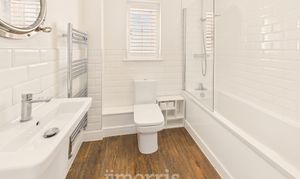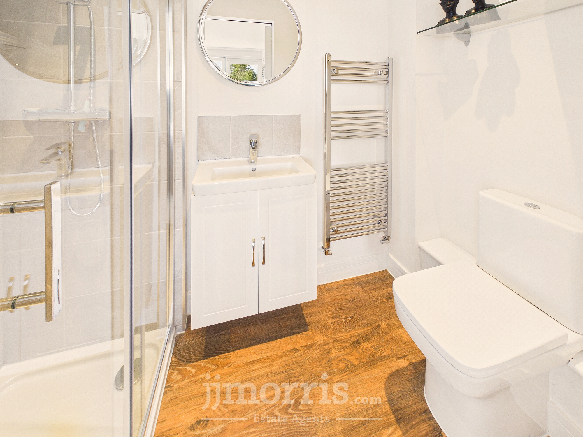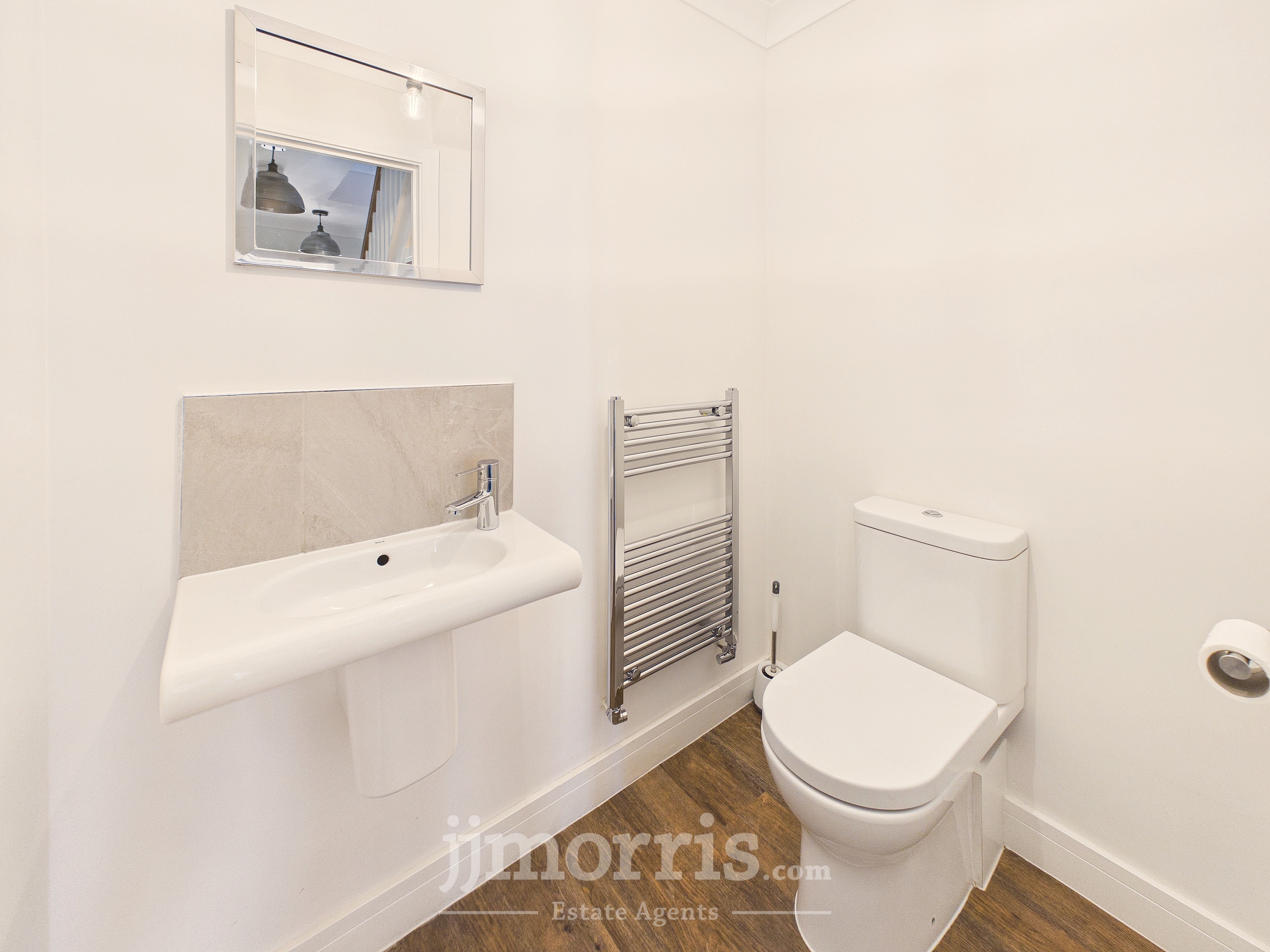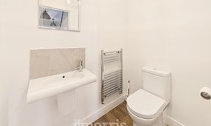 With a Karndean Oak floor with underfloor heating, white suite of Wash Hand Basin and WC, chrome heated towel rail/radiator, tile splashback, Manrose extractor fan, ceiling light and a toilet roll holder.