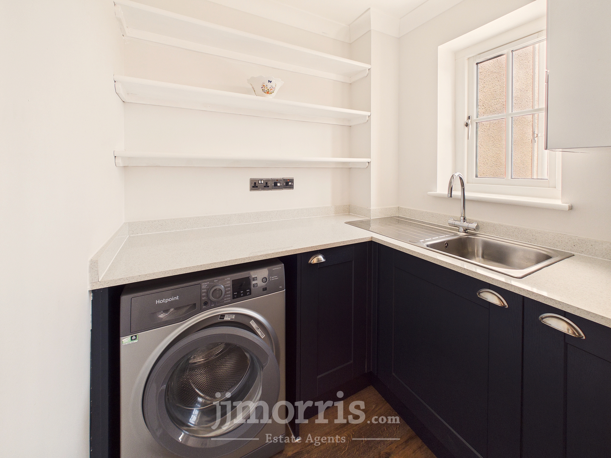 With Karndean Oak floor with underfloor heating, coved ceiling, ceiling light, mains smoke detector, Manrose extractor fan, double glazed window, fitted floor cupboards with quartz worktop, inset single drainer stainless steel sink unit with mixer tap, plumbing for automatic washing machine, appliance points, recessed electricity consumer unit, wall shelves and a Vaillant wall mounted Gas Boiler (heating domestic hot water and firing central heating).