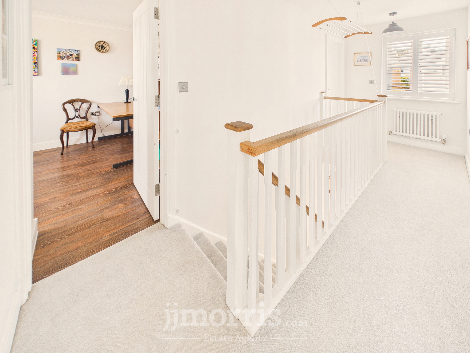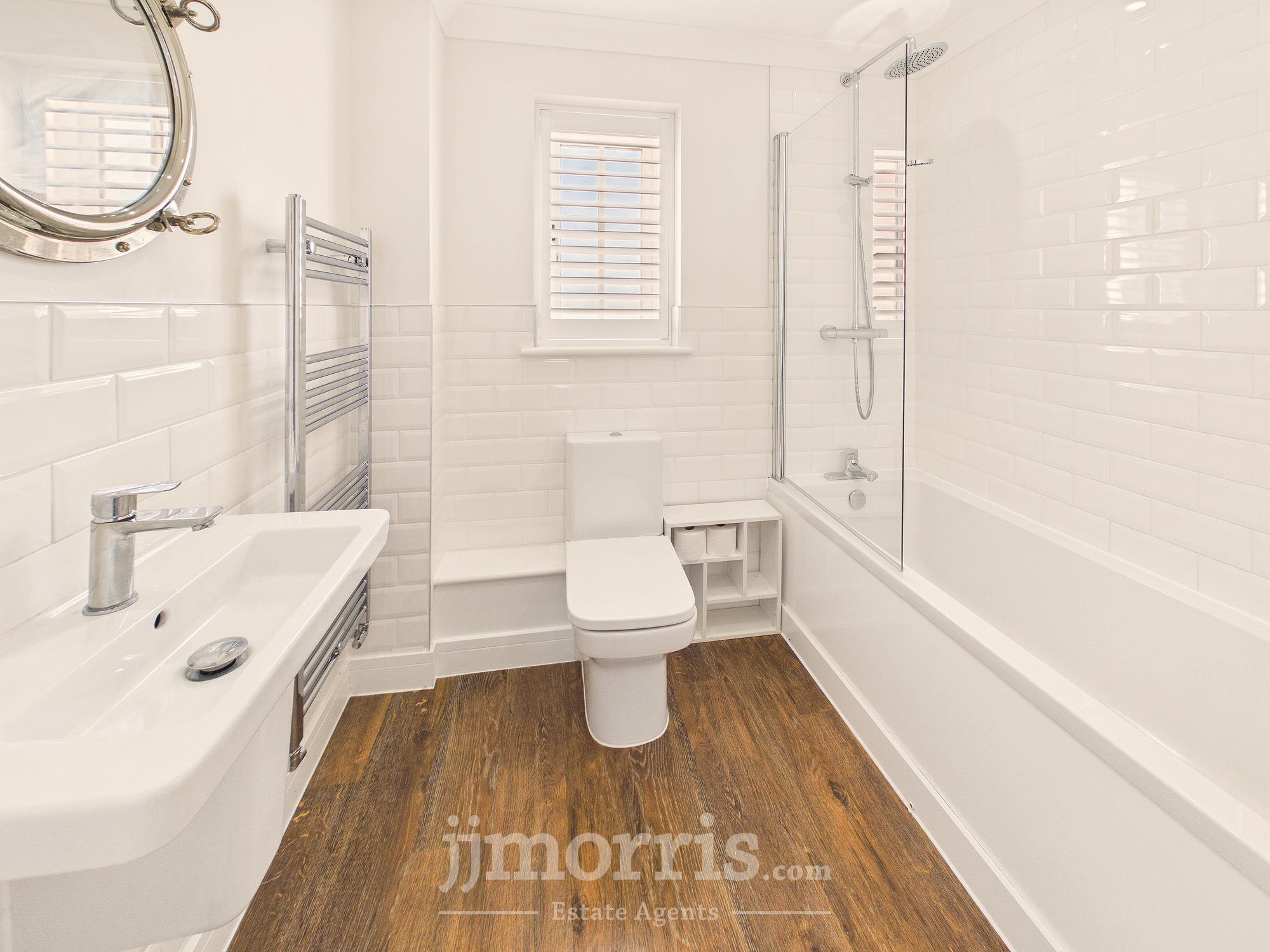 With a Karndean Oak floor, chrome heated towel rail/radiator, double glazed window with plantation shutters, white suite of panelled Bath, Wash Hand Basin and WC, thermostatic shower over bath with glazed shower screen, half tiled walls, 4 downlighters and an extractor fan.