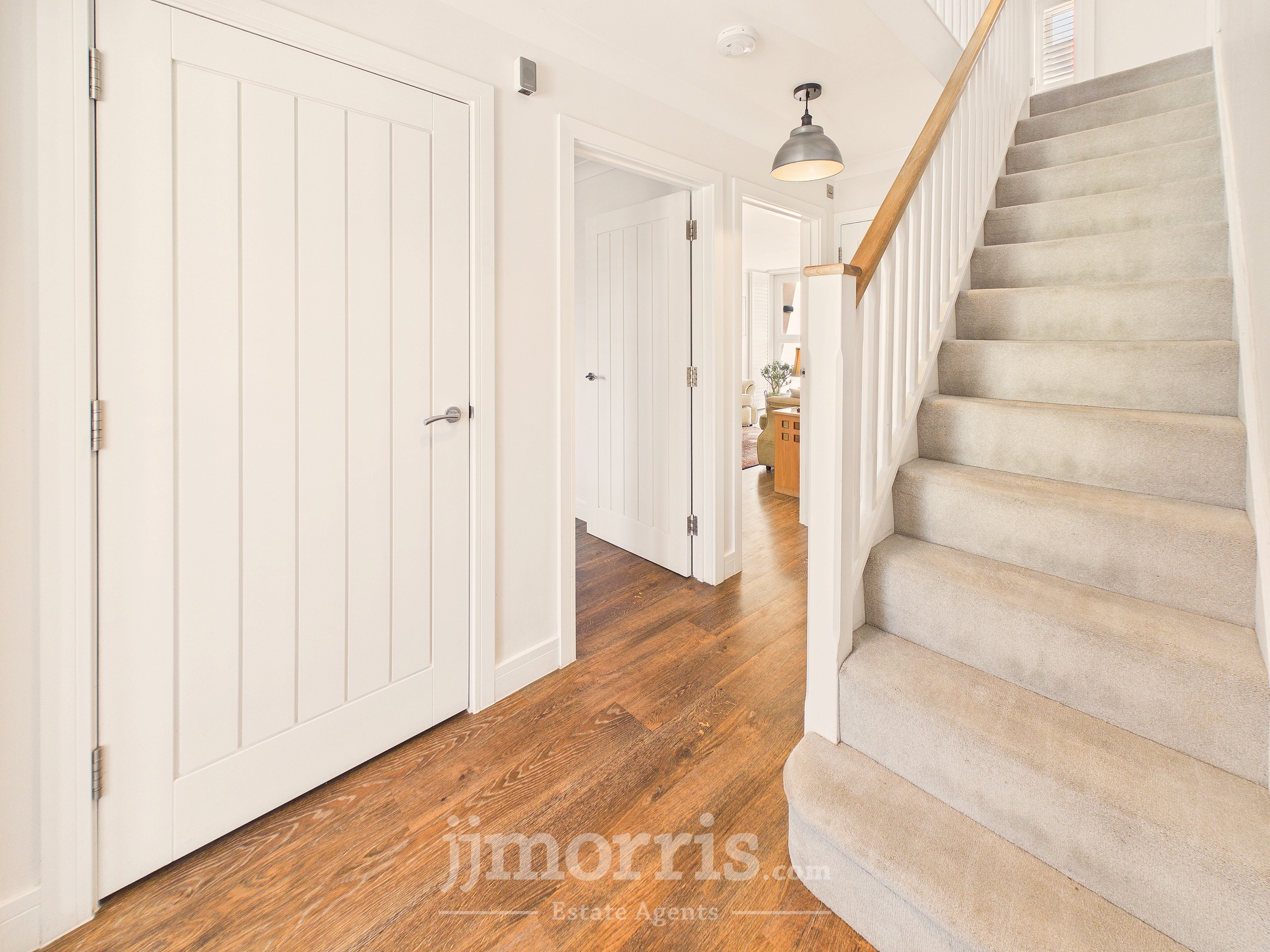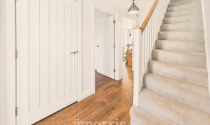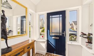 With a Karndean Oak floor with underfloor heating, 2 ceiling lights, mains smoke detector, staircase to First Floor, central heating thermostat control, Understairs Cupboard with central heating manifold and coat hooks, walk-in Cloaks Cupboard with a Karndean Oak floor, coat hooks, shelf and electric light and doors to Kitchen/Dining Room, Sitting Room and:-
