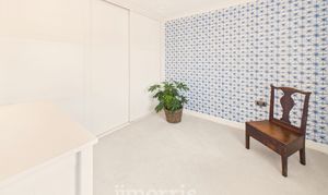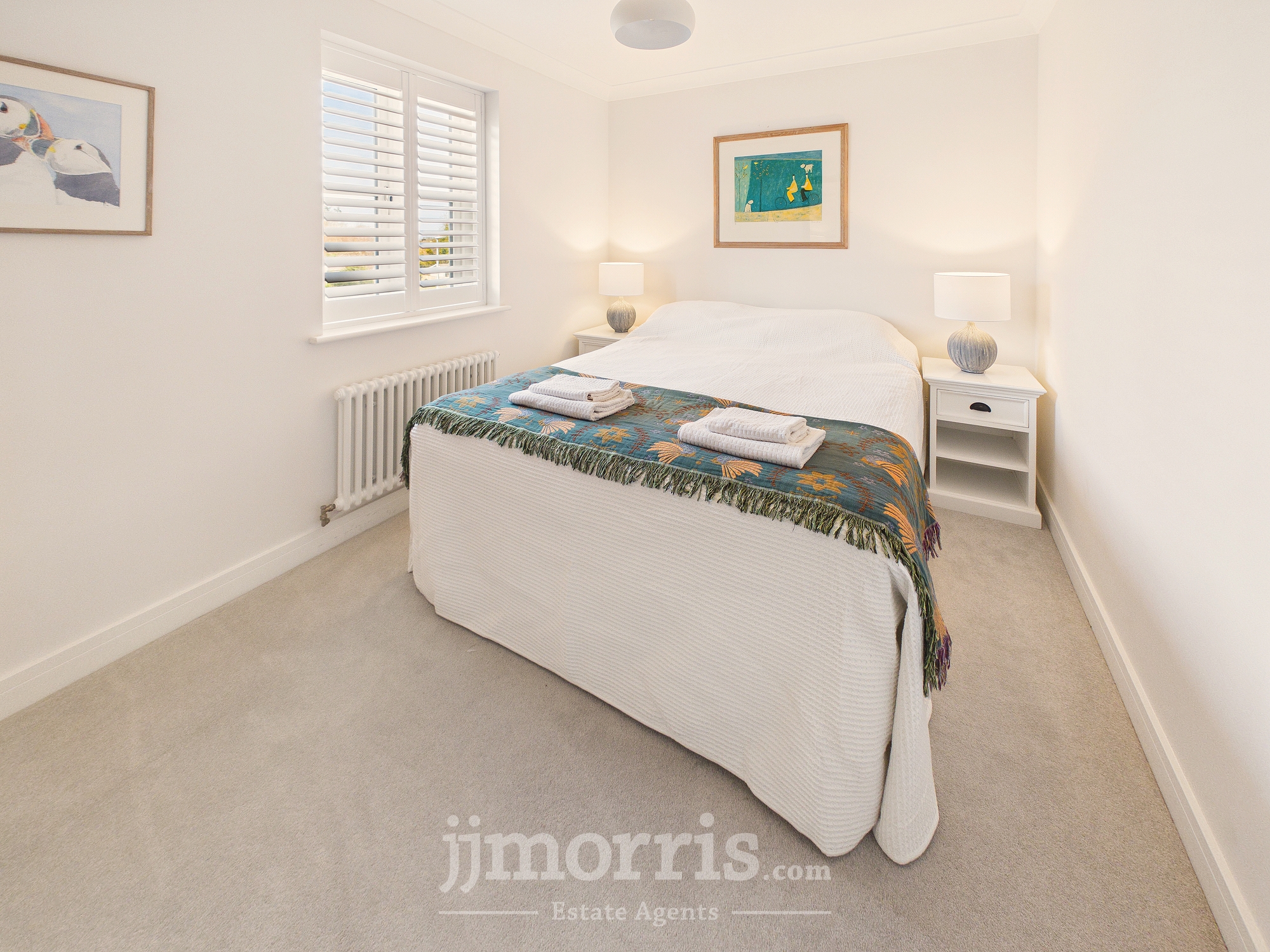 With fitted carpet, double glazed window with plantation shutters (affording a distant sea view), coved ceiling, ceiling light, designer column radiator, TV point and 6 power points.