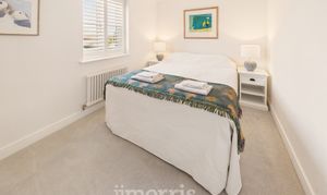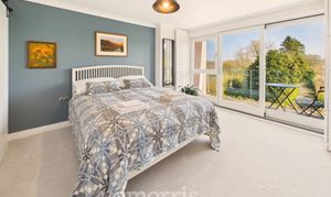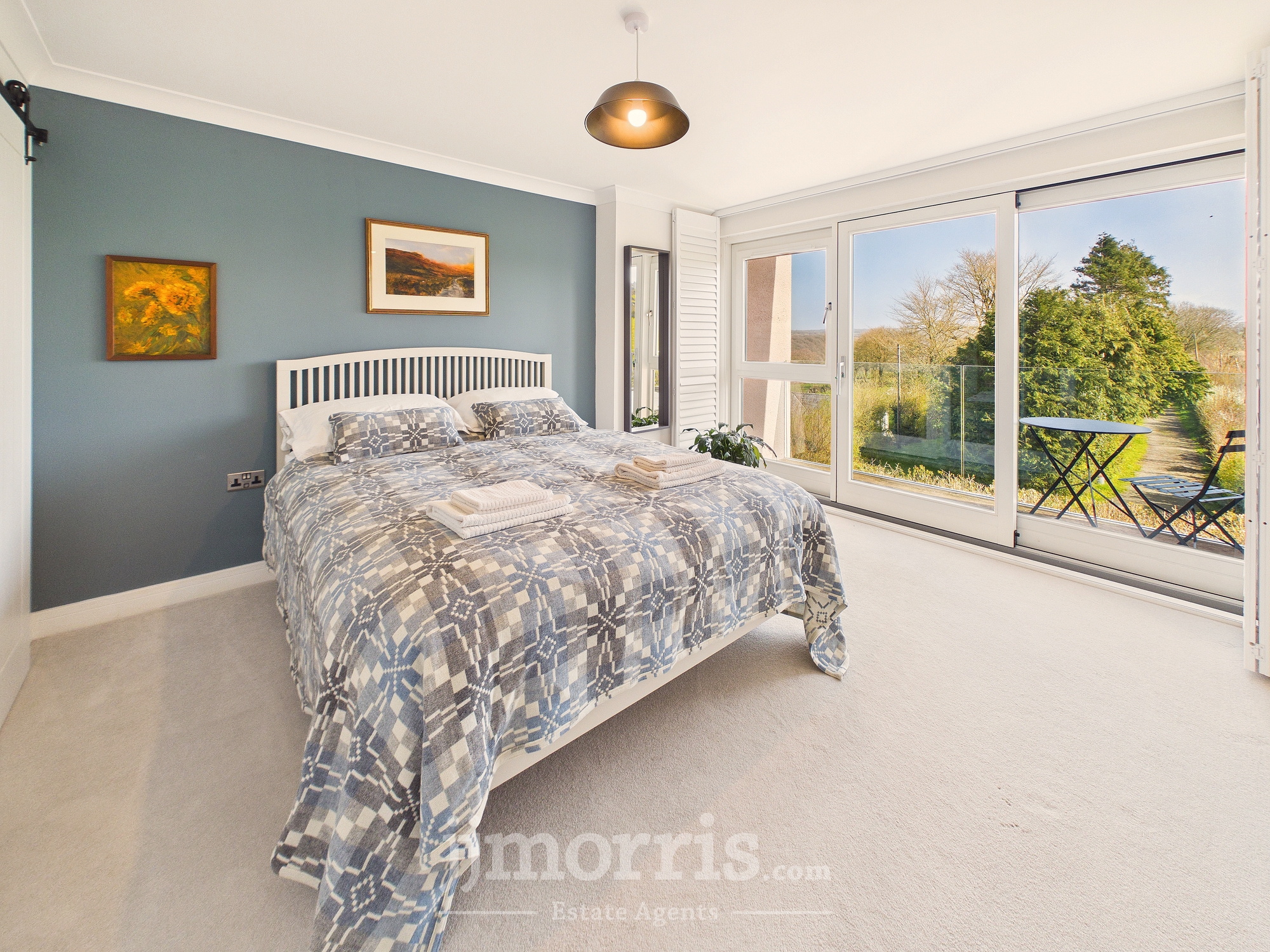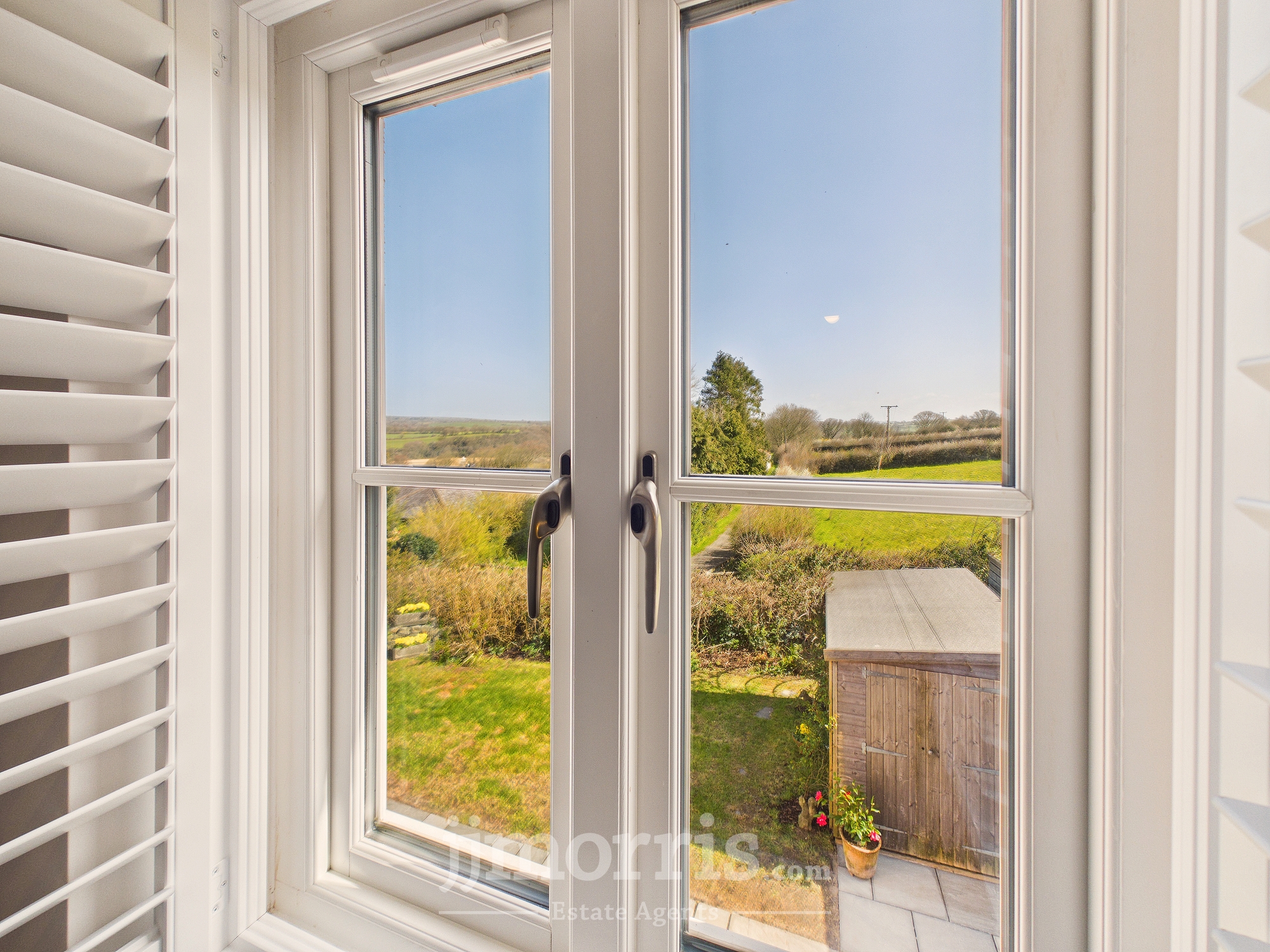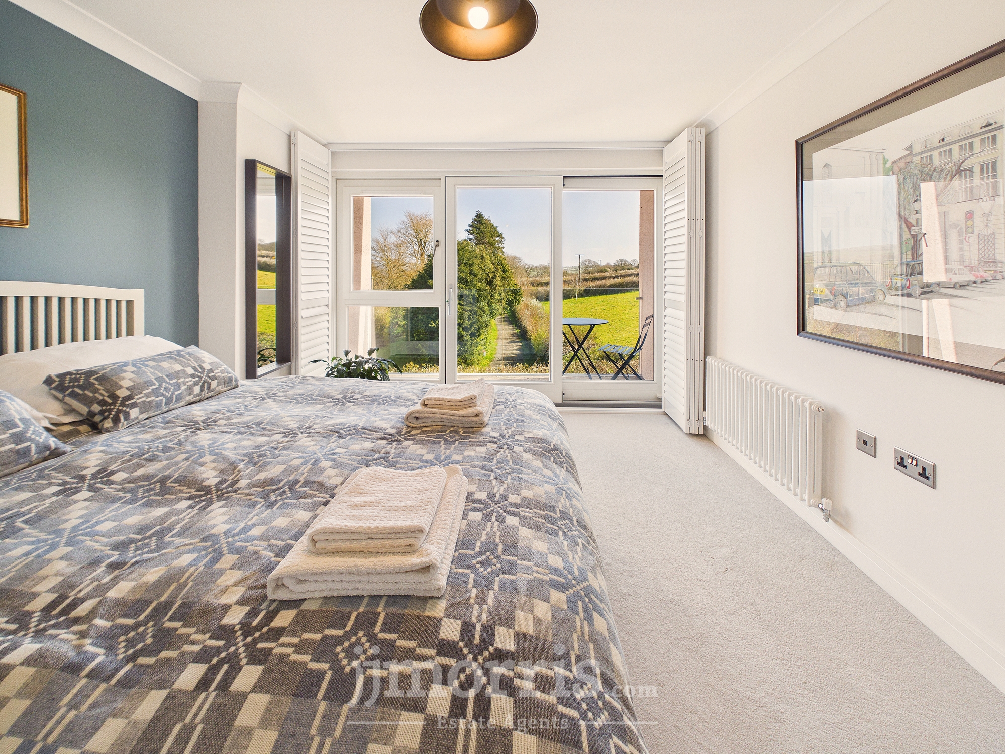 With fitted carpet, Farrow and Ball feature wall, coved ceiling, ceiling light, designer column radiator, central heating thermostat control, TV point, 6 power points, sliding door to En Suite Shower Room, walk-in wardrobe and a double glazed French door with plantation shutters leading to an:-