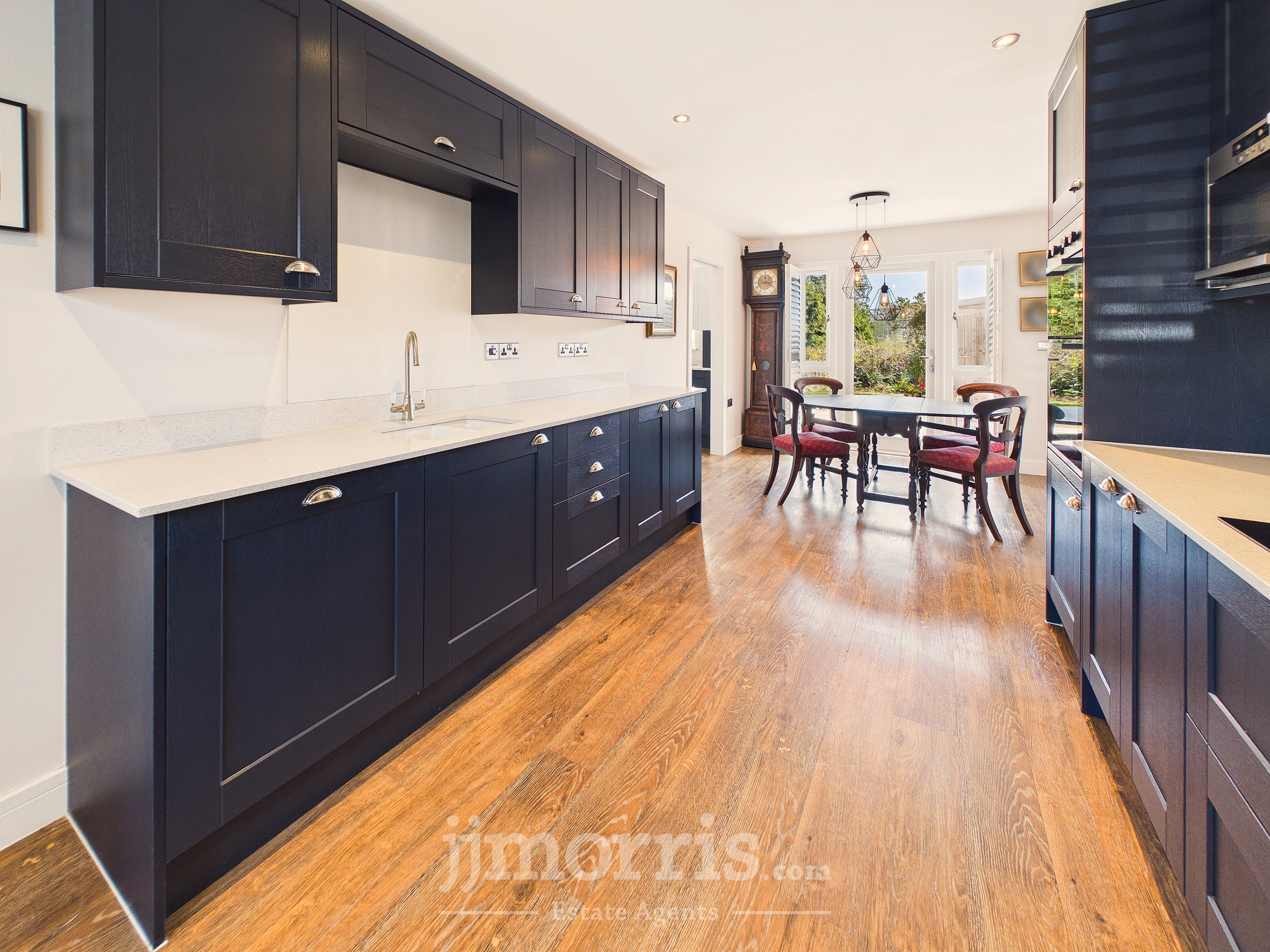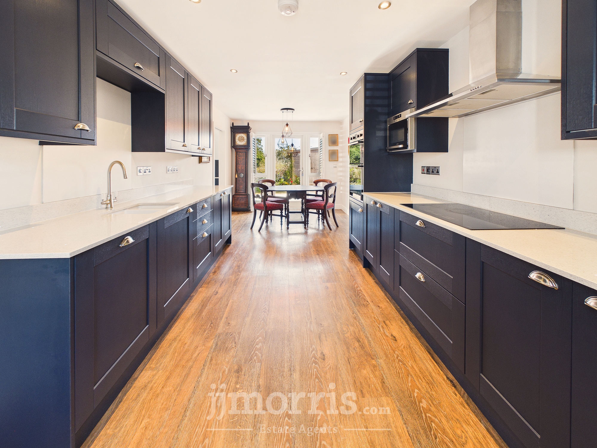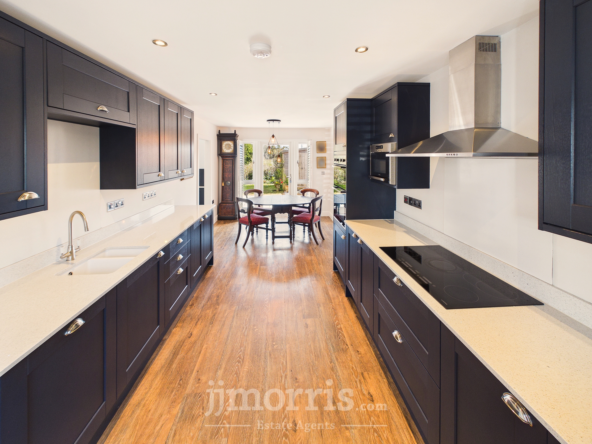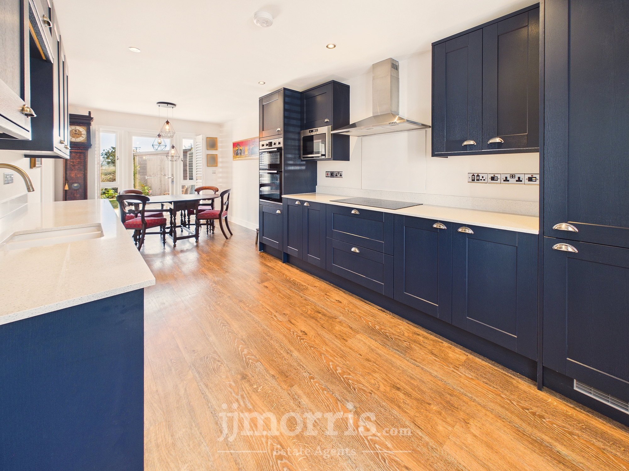 (approx) With a Karndean Oak floor with underfloor heating, double glazed window with plantation shutters, ceiling light and 6 downlighters, mains smoke detector, range of Howdens fitted floor and wall cupboards with quartz worktop, built in Lamona Fridge Freezer, built in Lamona eye level Double Oven/Grill, built in Lamona Microwave, cooker box, appliance points, 15 power points, double glazed French door with plantation shutters leading to a to rear Indian Sandstone paved Patio, Lamona 5 ring Induction Hob with glass splashback, Cooker Hood (externally vented), central heating thermostat control, built in Lamona Dishwasher and an opening to a:-