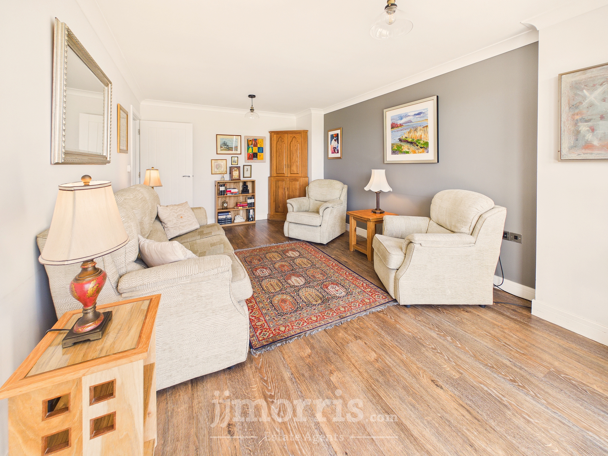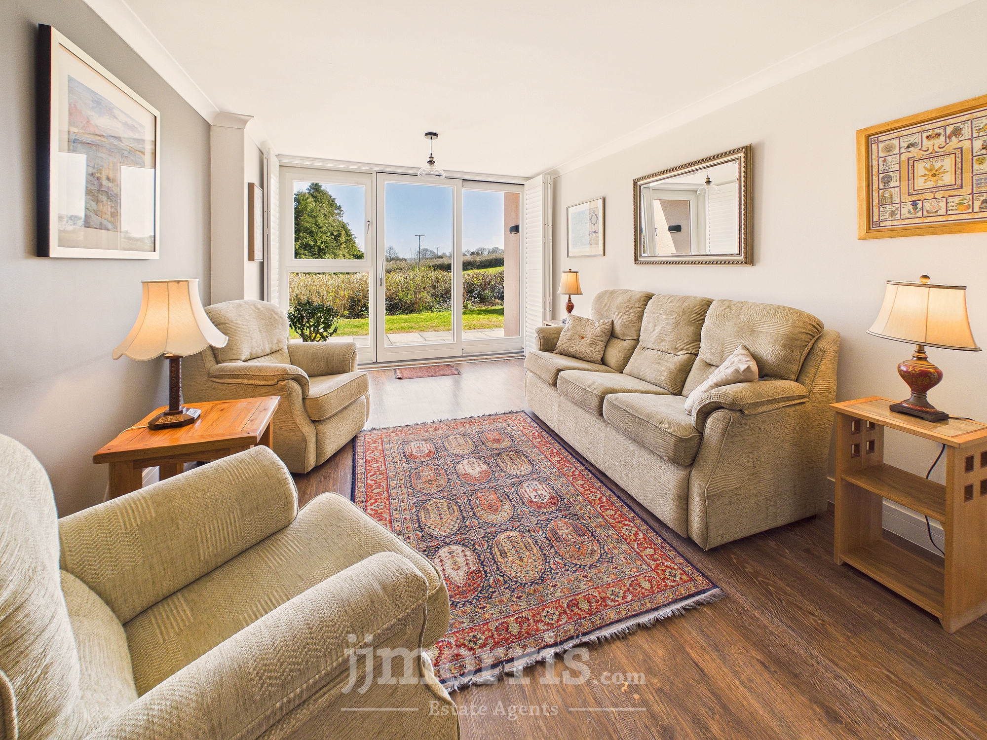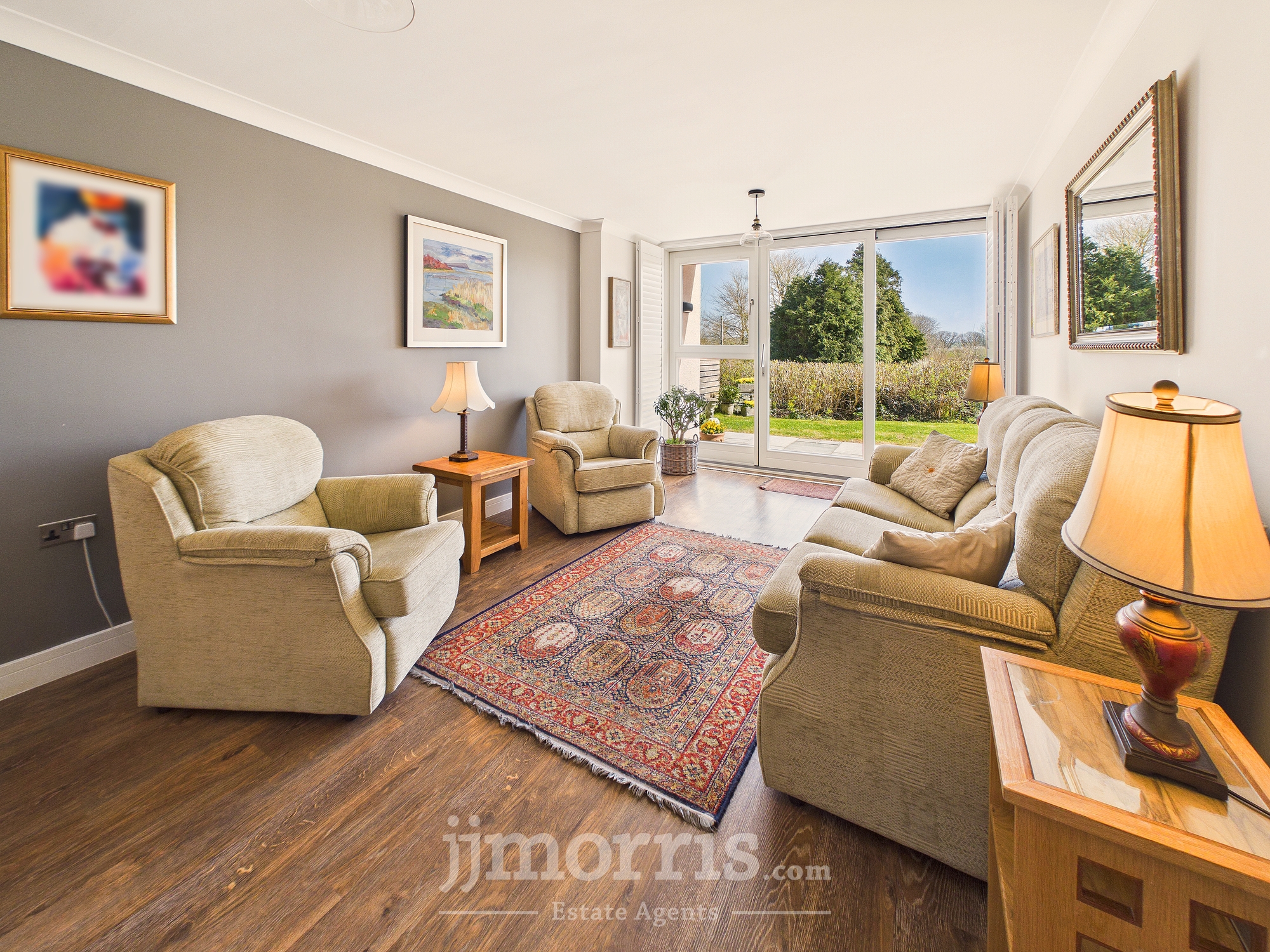 With a Karndean Oak floor with underfloor heating, coved ceiling, 2 ceiling lights, TV point, telephone point, 8 power points, double glazed patio door with plantation shutters leading to an Inverted Patio, central heating thermostat control and a feature wall with Farrow and Ball paint.