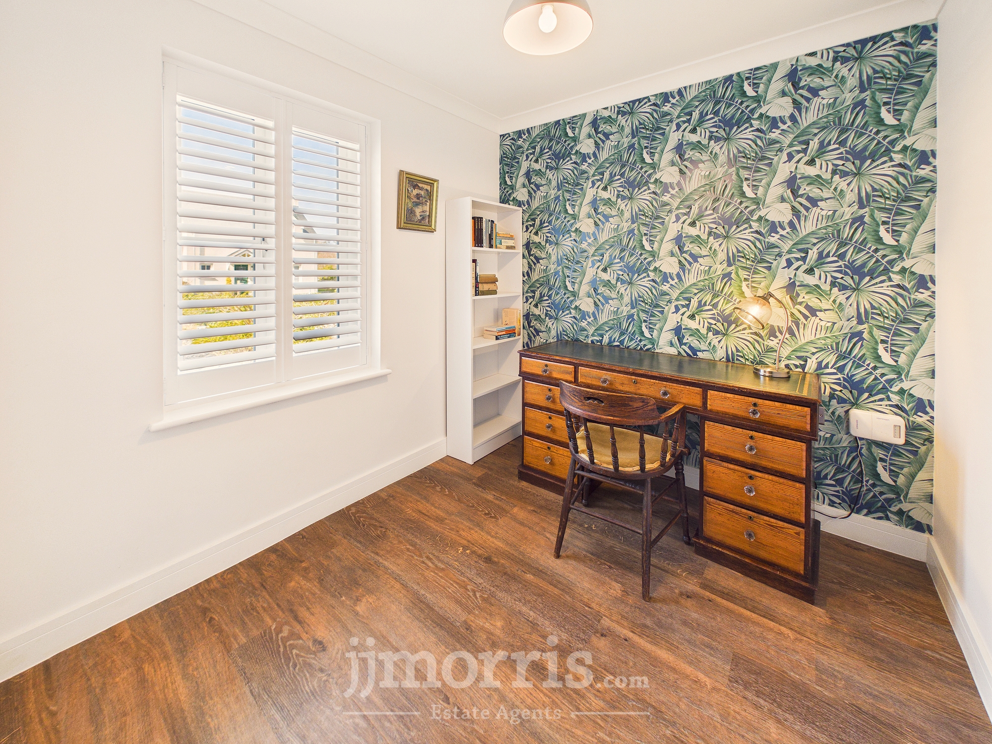 With a Karndean Oak floor with underfloor heating, coved ceiling, ceiling light, double glazed window with plantation shutters, central heating thermostat control and 4 power points.