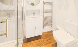 With a Karndean Oak floor, white suite of WC, Wash Hand Basin in vanity surround and glazed and tiled Shower Cubicle with a thermostatic shower, chrome heated towel rail/radiator, tile splashback, extractor fan, 3 downlighters, coved ceiling and a glass shelf.