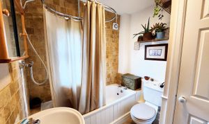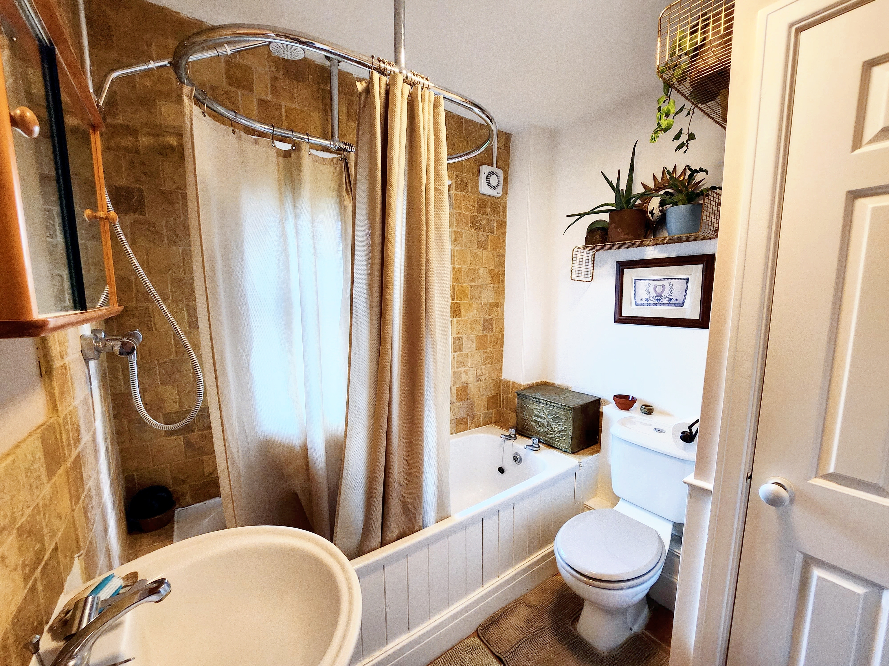 Window to rear, panel bath with shower over, low level wc and sink unit