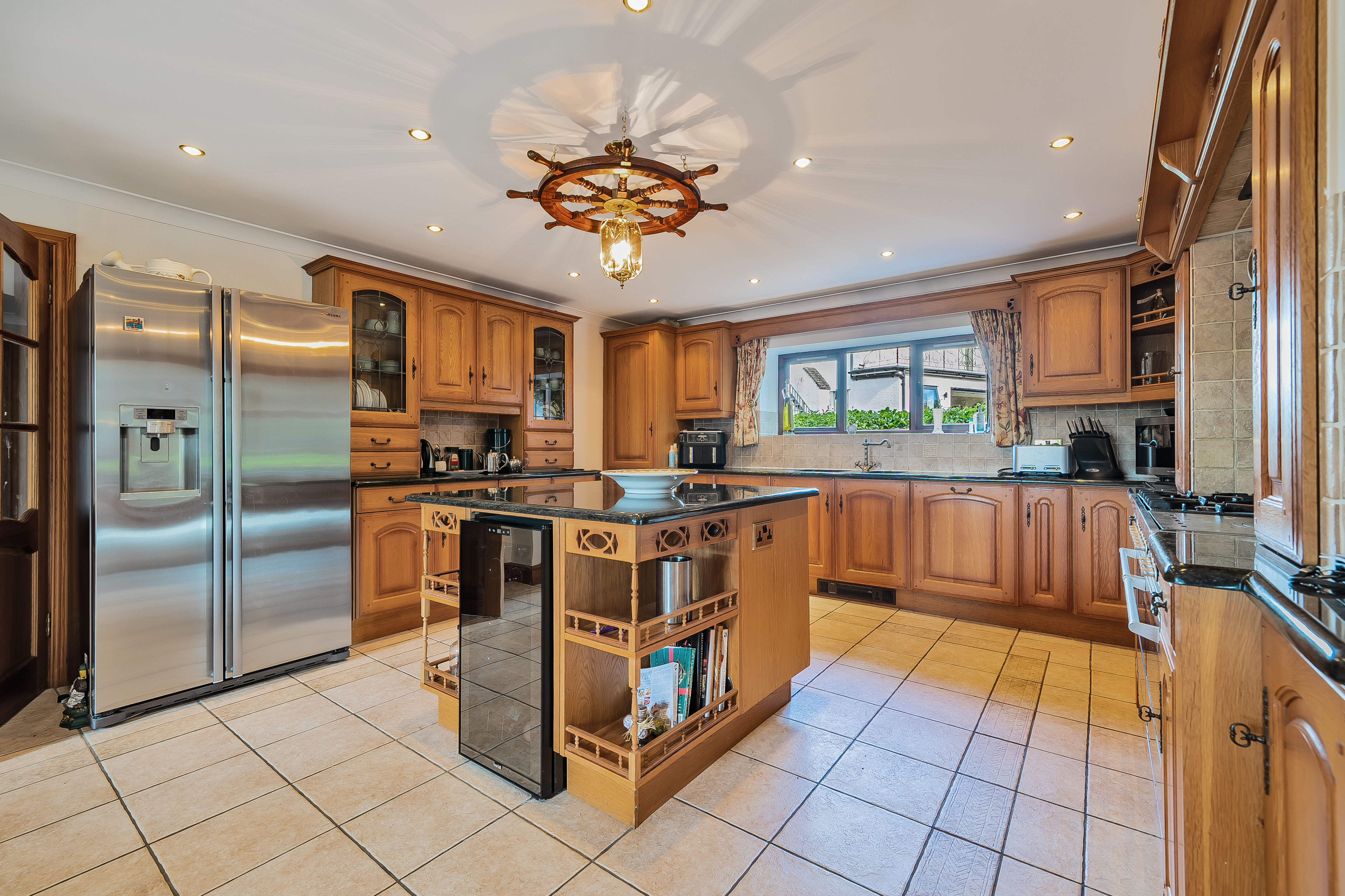 Moving back to the hallway, the spacious kitchen/dining room is located to the right. This stylish, fully fitted kitchen features elegant cherry wood units with contrasting black granite worktops. As well as ample floor and wall units there is a central island, an integrated dishwasher and space for wine fridge, a range cooker and an American-style fridge freezer. The kitchen also has a traditional built-in dresser and space for a large breakfast table which offers lovely views over the surrounding farmland, creating a serene backdrop for daily living.