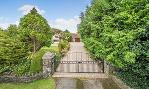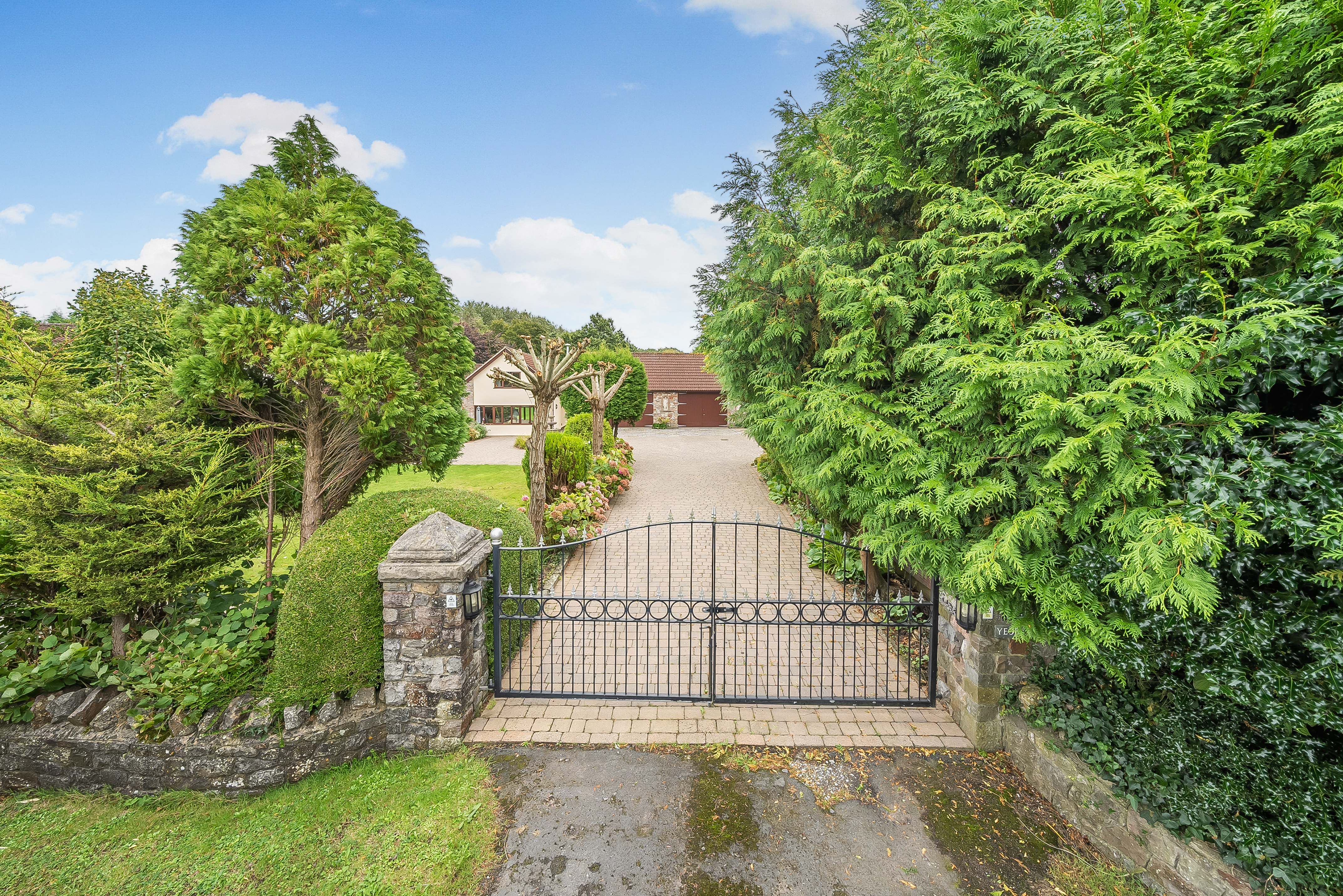 The property is approached through electronically controlled wrought iron gates, flanked by mature trees that open onto a sweeping block-paved driveway. At the centre of the drive is a striking fountain, creating a stunning focal point in front of the entrance to this traditional stone and render built home.