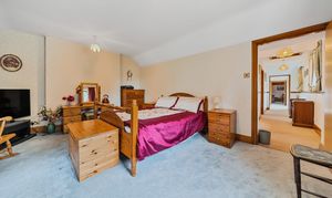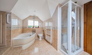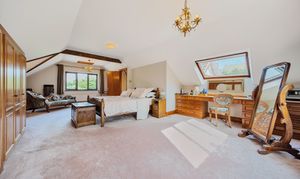 Upstairs, the master suite is a luxurious retreat, offering a large bedroom with extensive fitted wardrobes, a spacious seating area with breath-taking views, and a light-filled en-suite bathroom complete with both a shower and a bath and an array of fitted cupboards together with convenient under-eaves storage.