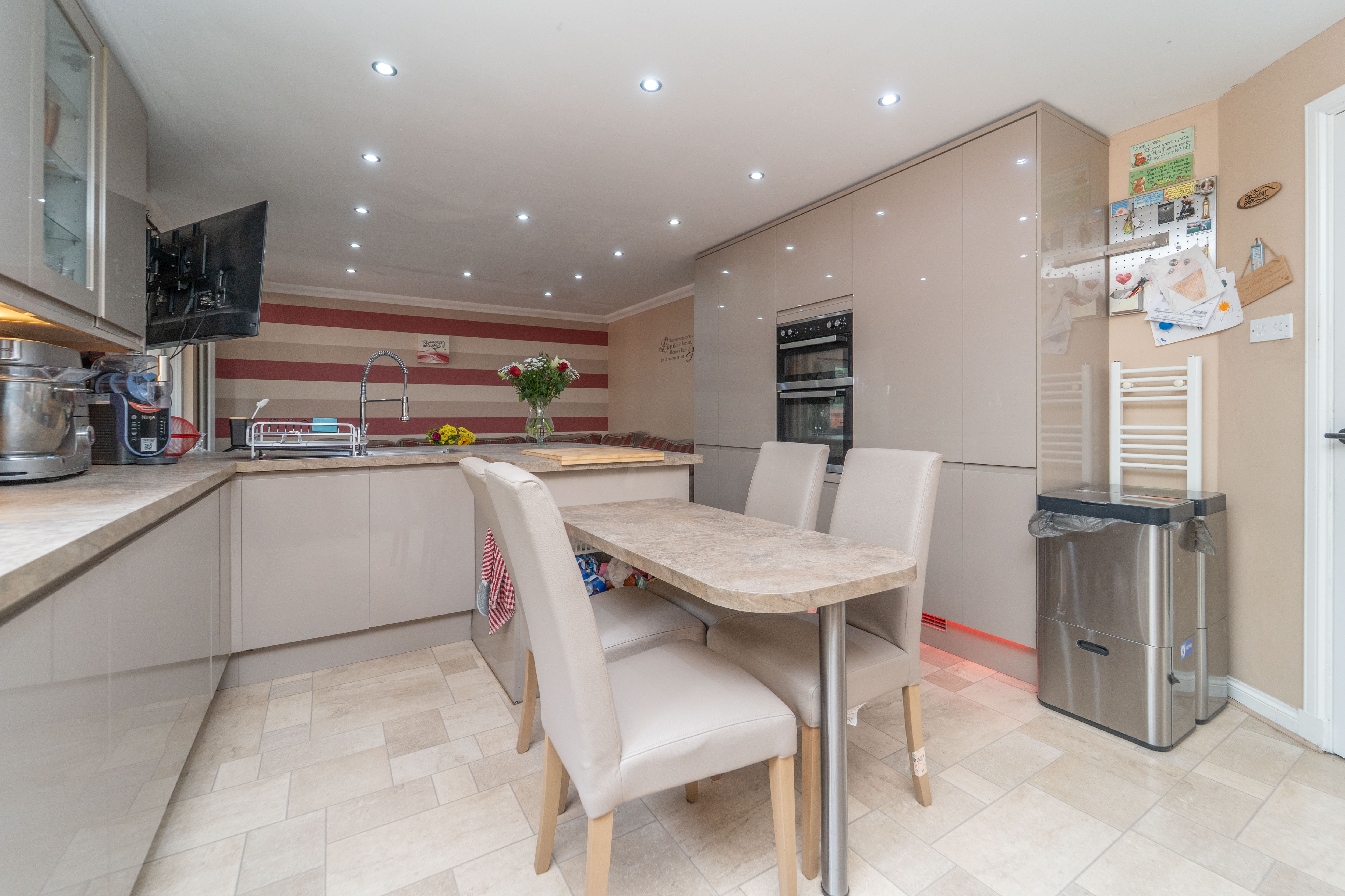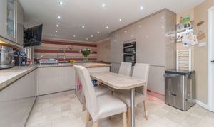 This generously proportioned room has an extensive range of wall and base units in a sleek beige gloss finish, complemented by laminate work surfaces and a red splashback. A lower level table extends from the worktop, providing a space for casual dining. The décor features neutral painted walls with a stylish feature wall and wooden flooring. The kitchen is well equipped with a range of built in appliances, including an eye level oven and grill, six ring gas hob, stainless steel extractor hood, integrated tall fridge and freezer, and dishwasher, all included in the sale. There is also space for a washing machine and tumble dryer. Natural light enters through a rear facing window. The sink area comprises of a stainless steel sink with mixer tap and drainer. This open plan room offers excellent flexibility, with space to create a second lounge or dining area if desired. Additional features include downlights, under unit lighting, three tall radiators, and power points.