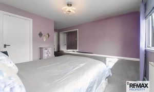 This charming room is decorated with soft lilac paint, a feature papered wall, and cosy carpet flooring. An integrated wardrobe offers ample hanging and shelving space, keeping the room neat and organised. A front-facing window fills the space with natural light, complemented by a ceiling light for evening illumination. Additional features include a radiator and convenient power points.