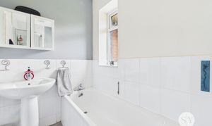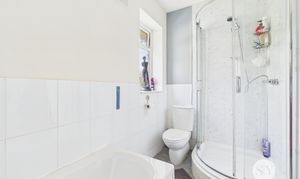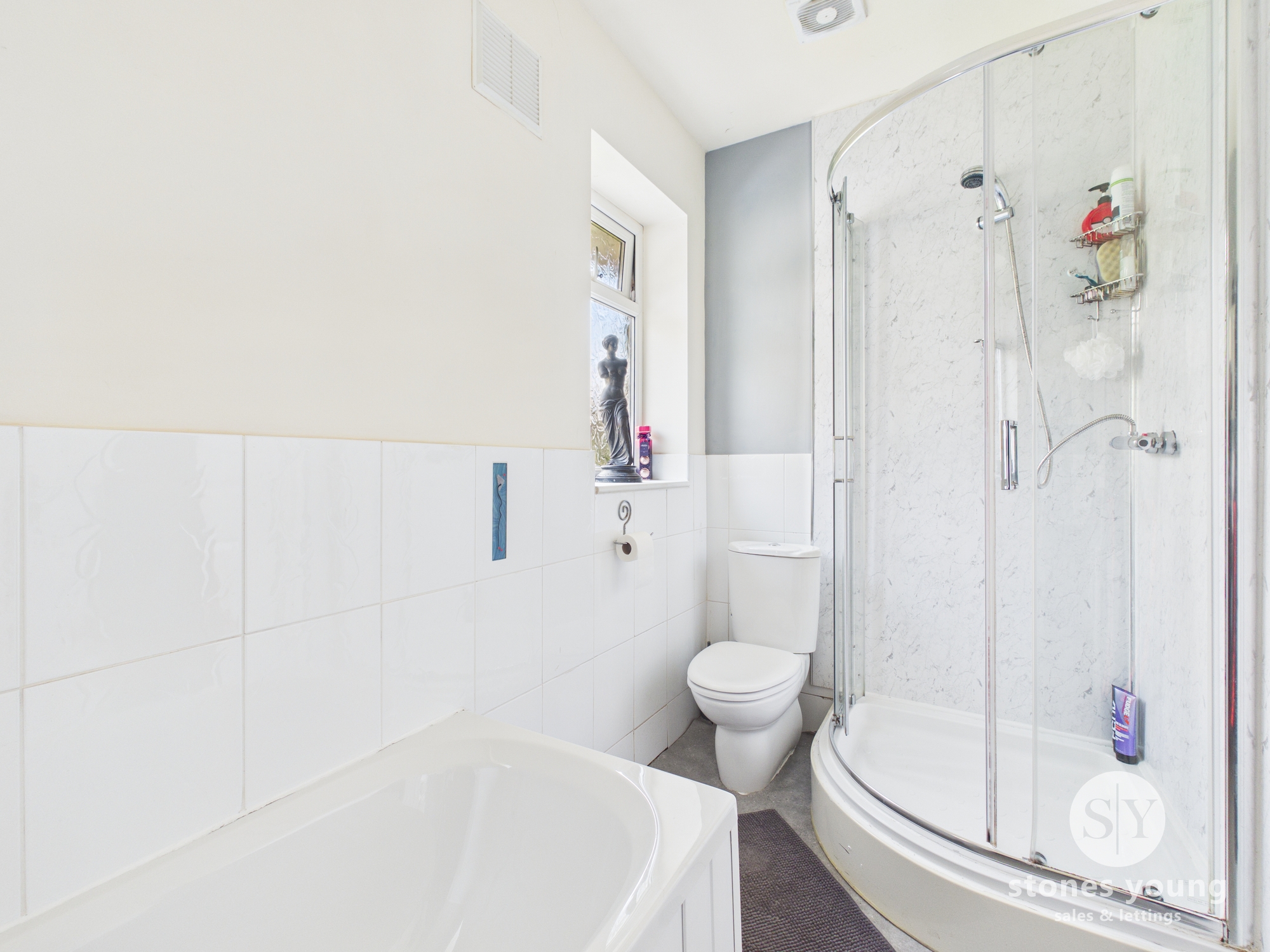 Four piece suite in white including shower enclosure with mains fed shower, tiled splashbacks, vinyl flooring, uPVC double glazed frosted window x2, panel radiator.