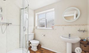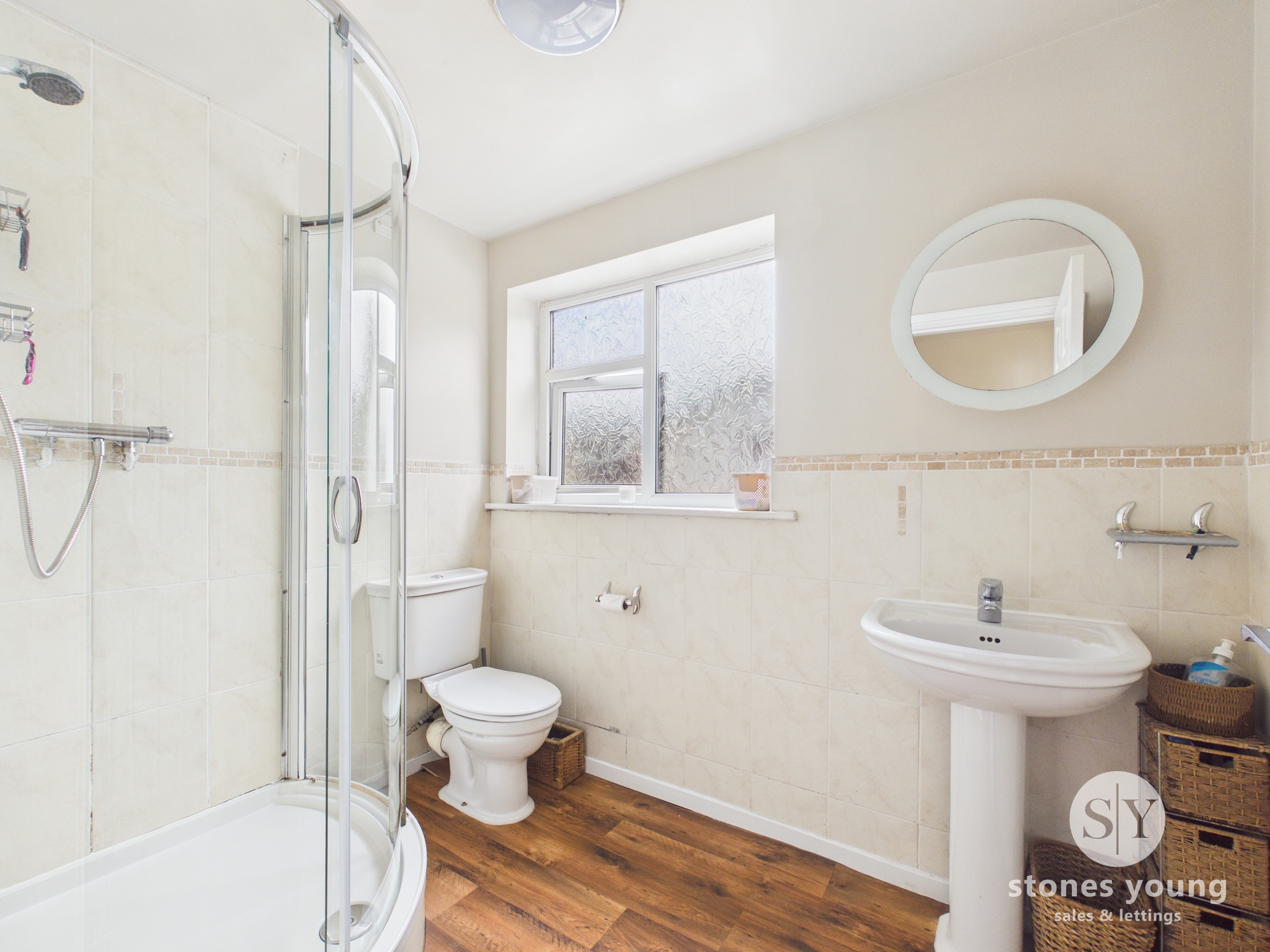 Three piece in white including shower enclosure with mains fed shower, tiled splashbacks, laminate flooring, uPVC double glazed frosted window, panel radiator.