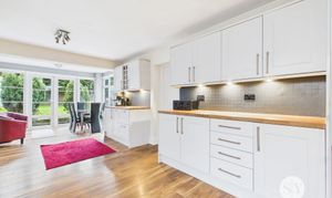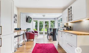 Featuring high-gloss white cabinetry, wood countertops, integrated appliances, a central island with breakfast bar, and ambient under-cabinet lighting, the kitchen space is both functional and well presented. French doors and expansive windows flood the kitchen and adjoining dining area with natural light, while providing seamless access to the garden for effortless indoor-outdoor living. The generously sized, private garden is a true highlight - offering lush lawns, mature trees, privacy fencing, a decked patio, and dedicated outdoor seating areas, perfect for summer gatherings or quiet relaxation. Additional features include a spacious driveway with ample off-road parking, an attached garage, and practical outdoor storage solutions for ultimate convenience.