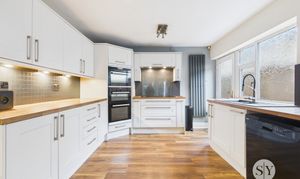 Range of fitted wall and base units with contrasting butchers block work surfaces, 1 1/2 sink and drainer, tiled splashbacks, integral double electric oven and microwave, induction hob, space for American style fridge freezer, plumbed for dishwasher, laminate flooring, uPVC double glazed windows and doors, upright radiator.