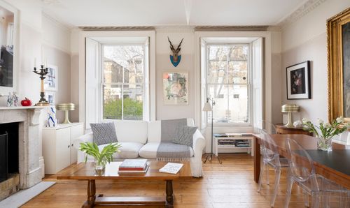 The home offers two double bedrooms with wood flooring on the first floor; the front double has bespoke fitted wardrobes and double-glazed sash windows. The third bedroom, with plywood floor and stylish en-suite shower room, is located on the top floor. The whole space draws exceptional light through generously sized windows and skylights.