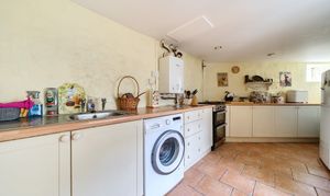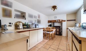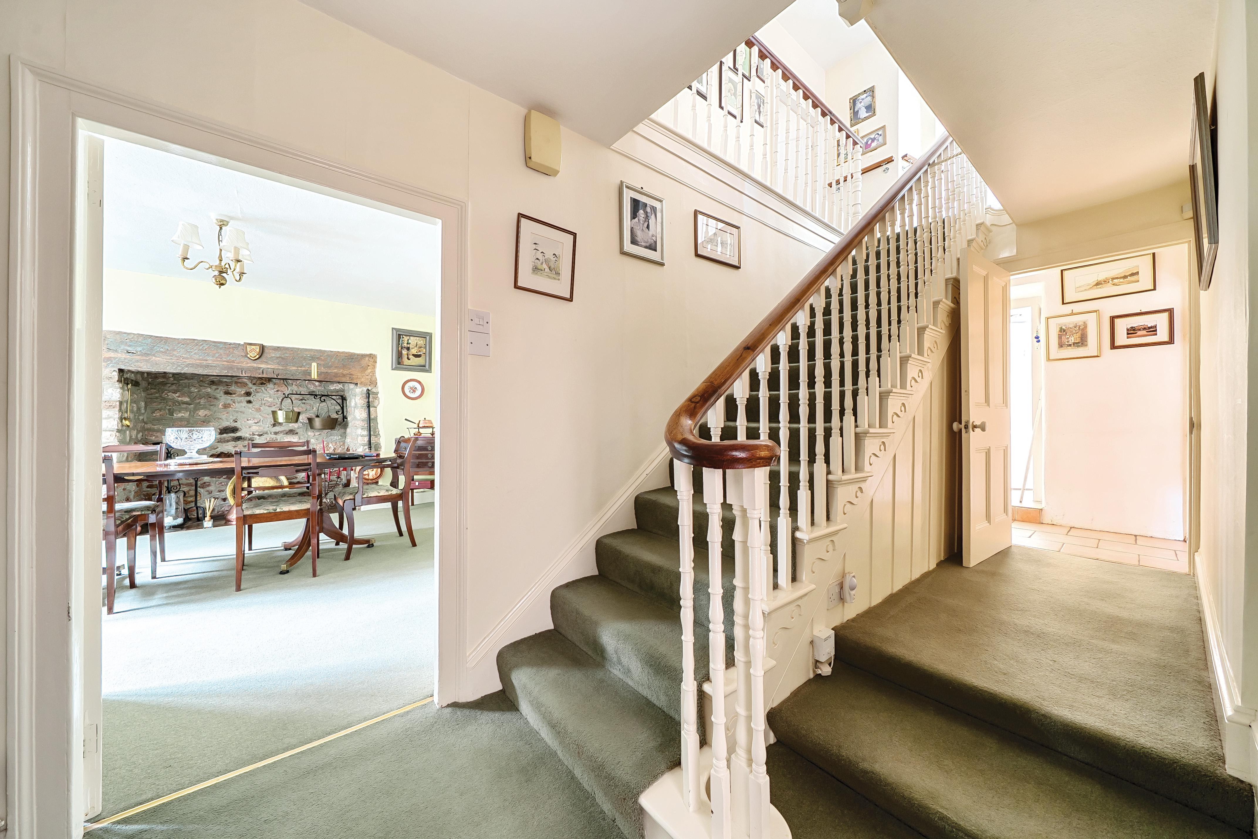 At the rear of the house, the warm and welcoming kitchen/breakfast room provides a further gathering space, centred around a second inglenook fireplace with original bread oven and a gas-fired Rayburn. A former coal store now serves as a useful utility room and has space for a washing machine, tumble dryer and further fridge/freezer.