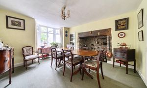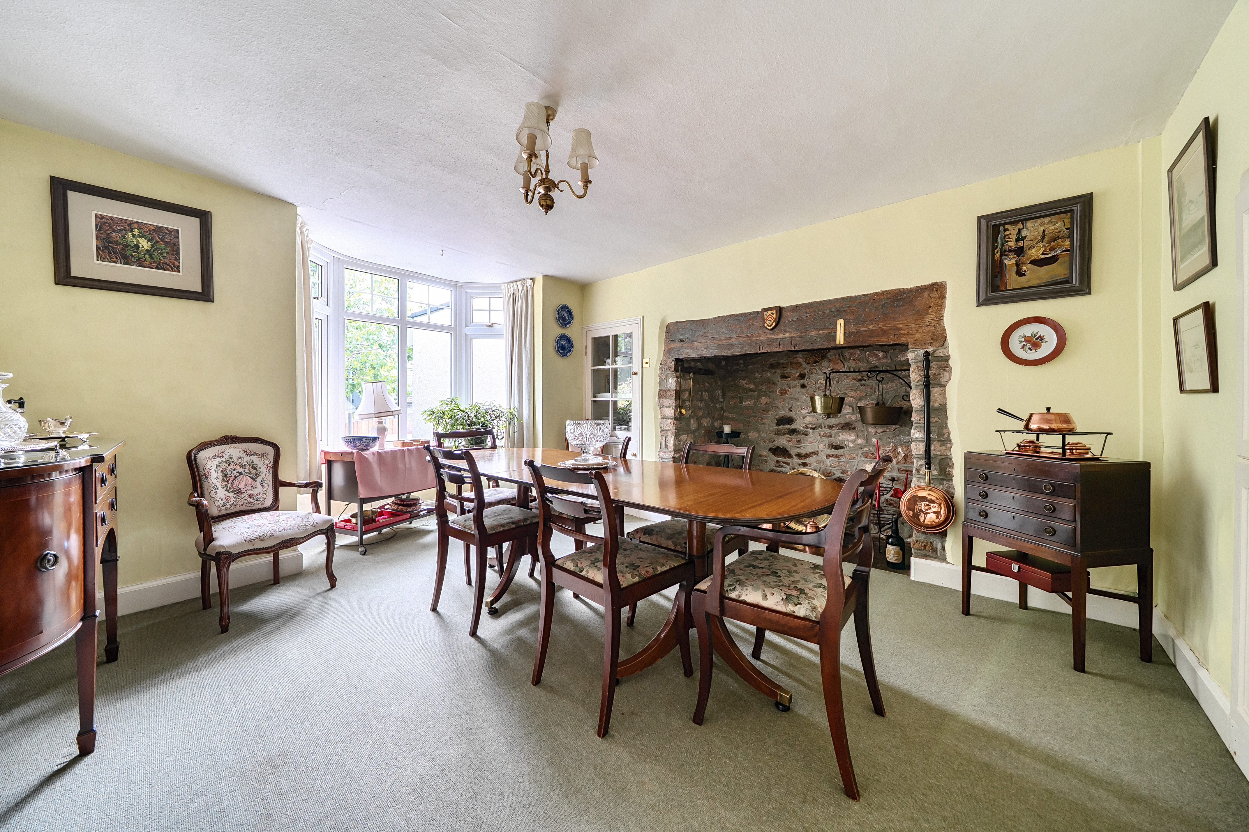 To the left, the formal dining room sits in what is thought to be the oldest part of the house, featuring a stunning original stone inglenook fireplace with recessed display cupboard and another lovely bay window.