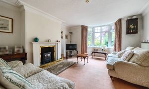 To the right lies the large, split-level sitting room — formerly two separate rooms — now a lovely bright versatile living space with a broad bay window and electric wood-effect burner, overlooking the front garden.