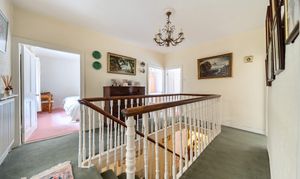 Upstairs, a galleried minstrel-style landing leads to five generously proportioned double bedrooms. The principal is a particularly lovely room with attractive far-reaching views. There are also two spacious bathrooms, one with white three-piece suite with a bath and the other, a large walk-in shower.