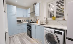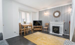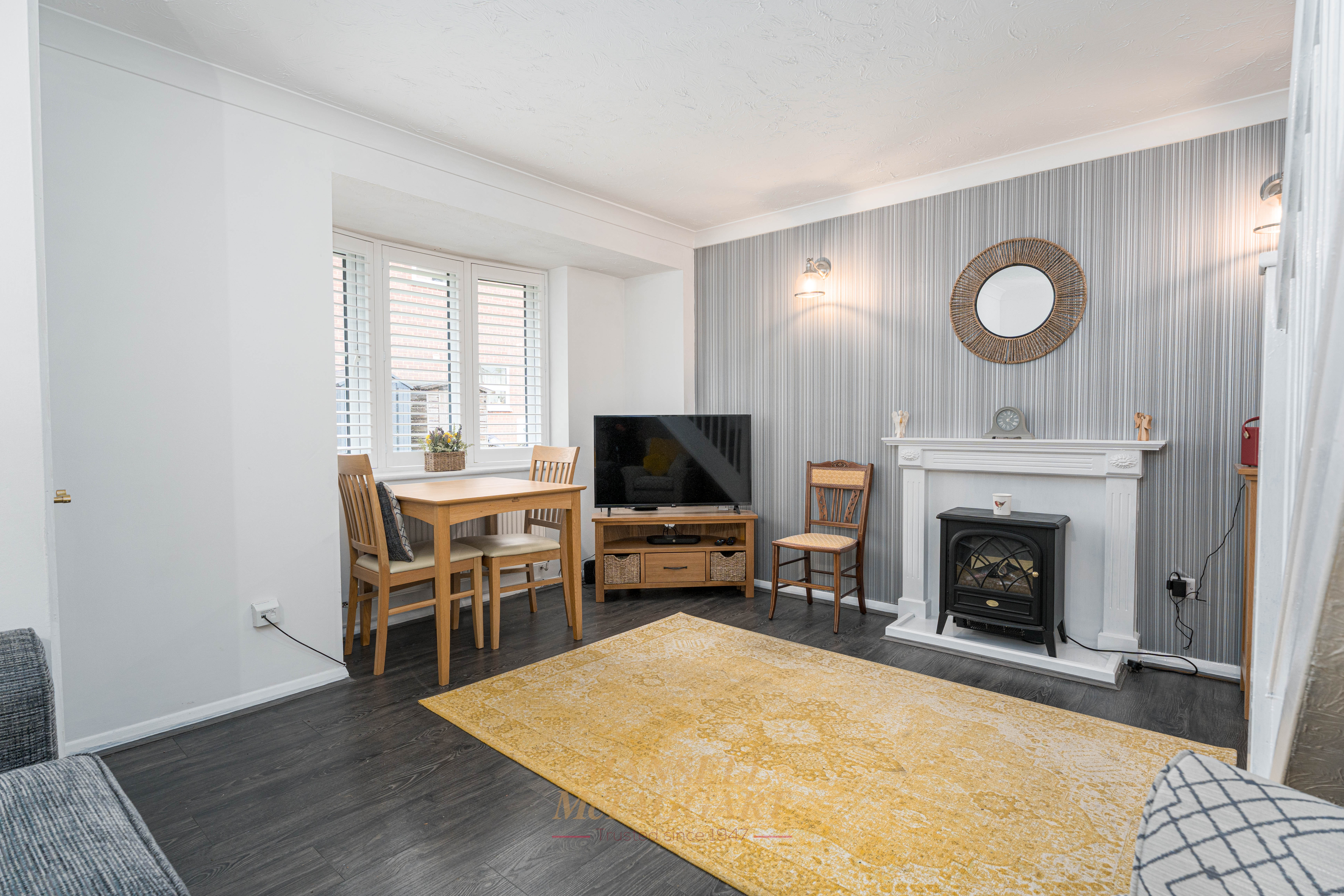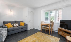 Stepping inside, a welcoming entrance hall leads to the kitchen and living/dining room. The modernised kitchen features a range of wall and base units, quartz worktops, space for appliances, and newly laid laminate flooring. The spacious living/dining room comfortably accommodates a 4–6 person dining table, large L-shaped sofa, and additional furnishings, while a generous bay window floods the space with natural light.