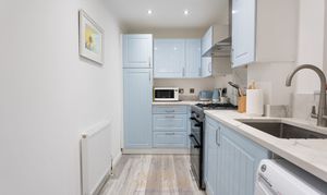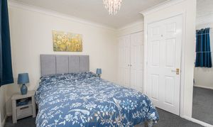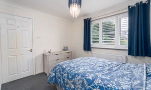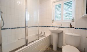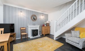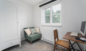 Upstairs, there are two bedrooms, including a well-proportioned principal bedroom with built-in wardrobes and a storage cupboard. The second bedroom is a small double, ideal as a child’s room or home office. The bathroom is fitted to a white suite comprising a bath with shower over, hand wash basin, and WC, finished with fully tiled walls.
