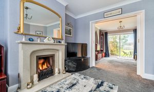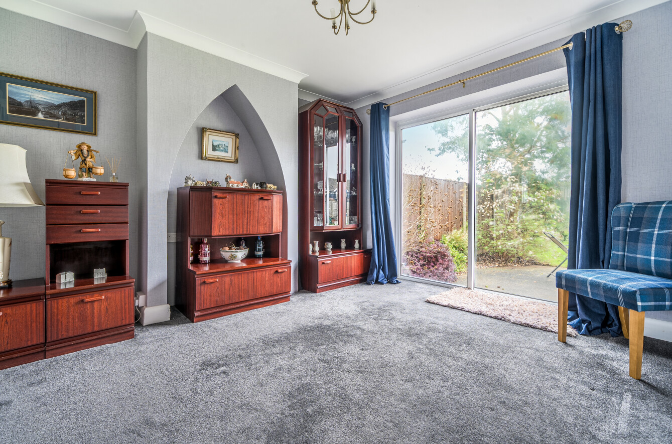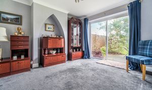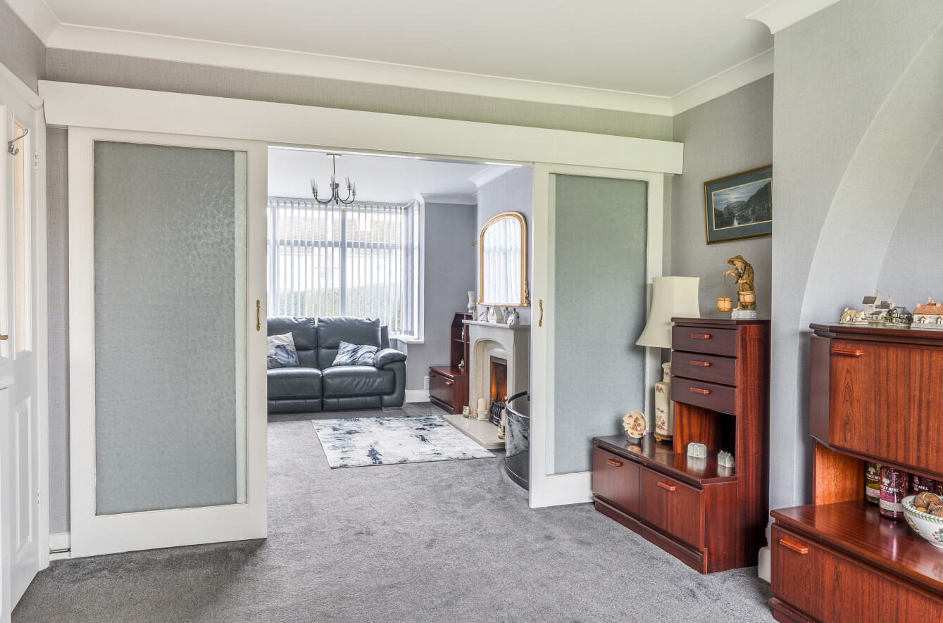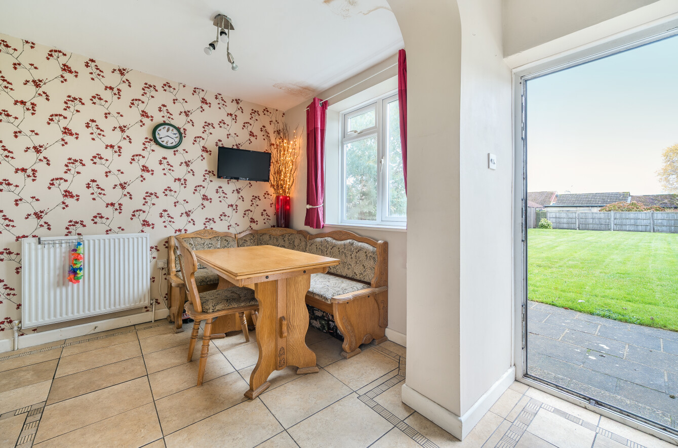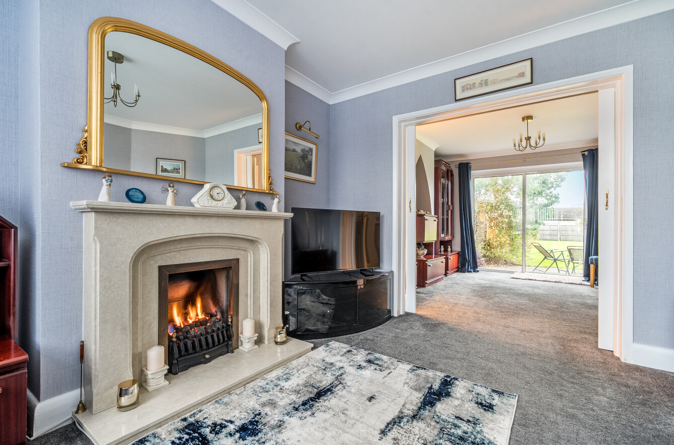 The property welcomes you with a spacious entrance hall, setting the tone for the light and airy interiors throughout. The dual aspect sitting and dining room is bright and inviting, featuring a deep bay window in the sitting area that floods the room with natural light and a traditional gas fire, providing a cosy focal point. The dining area opens via sliding double-glazed patio doors onto the rear garden, offering a seamless connection between indoor and outdoor living.
