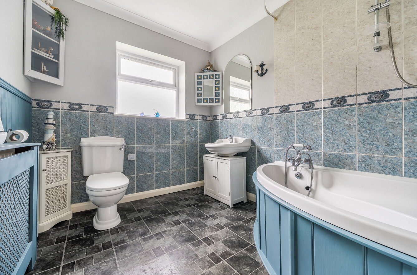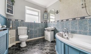 Upstairs, there are three bedrooms and a family bathroom featuring a corner bath and electric shower over, offering practicality alongside classic charm.