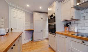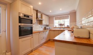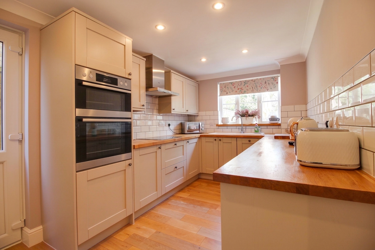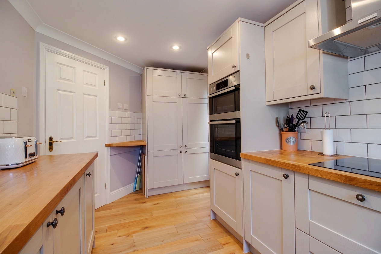 Window to the rear, side door leading to the outside and laminate wood flooring. Modern shaker style kitchen with a range of fitted wall and base units with Oa worksurfaces, inset porcelain sink/drainer, built-in electric double oven, 4-zone induction hob with extractor above, dishwasher, washing machine and fridge/freezer.