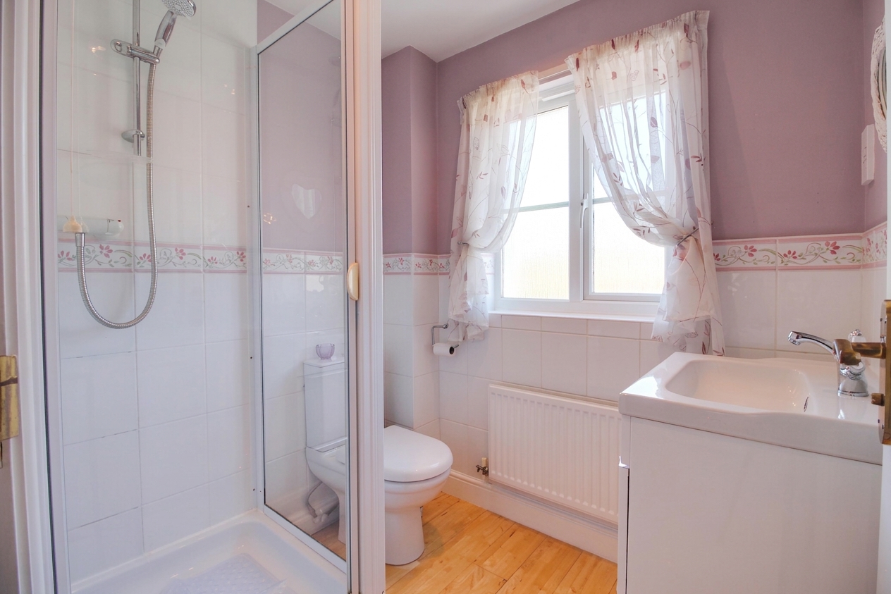 Window to the front, square shower enclosure with thermostatic shower, WC, wash basin with drawers below, extractor fan, shaver socket, towel radiator, half height wall tiling (fully tiled to shower enclosure) and laminate wood flooring.
