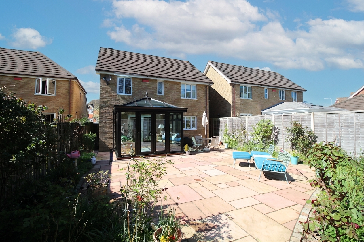 Outside, the property offers practical and low-maintenance living, with a driveway providing off-road parking and access to the integrated garage. To the rear, the garden has been designed for ease, with a paved layout that enjoys sunshine throughout the day, ideal for outdoor dining, children’s play, or simply unwinding during the warmer months.
