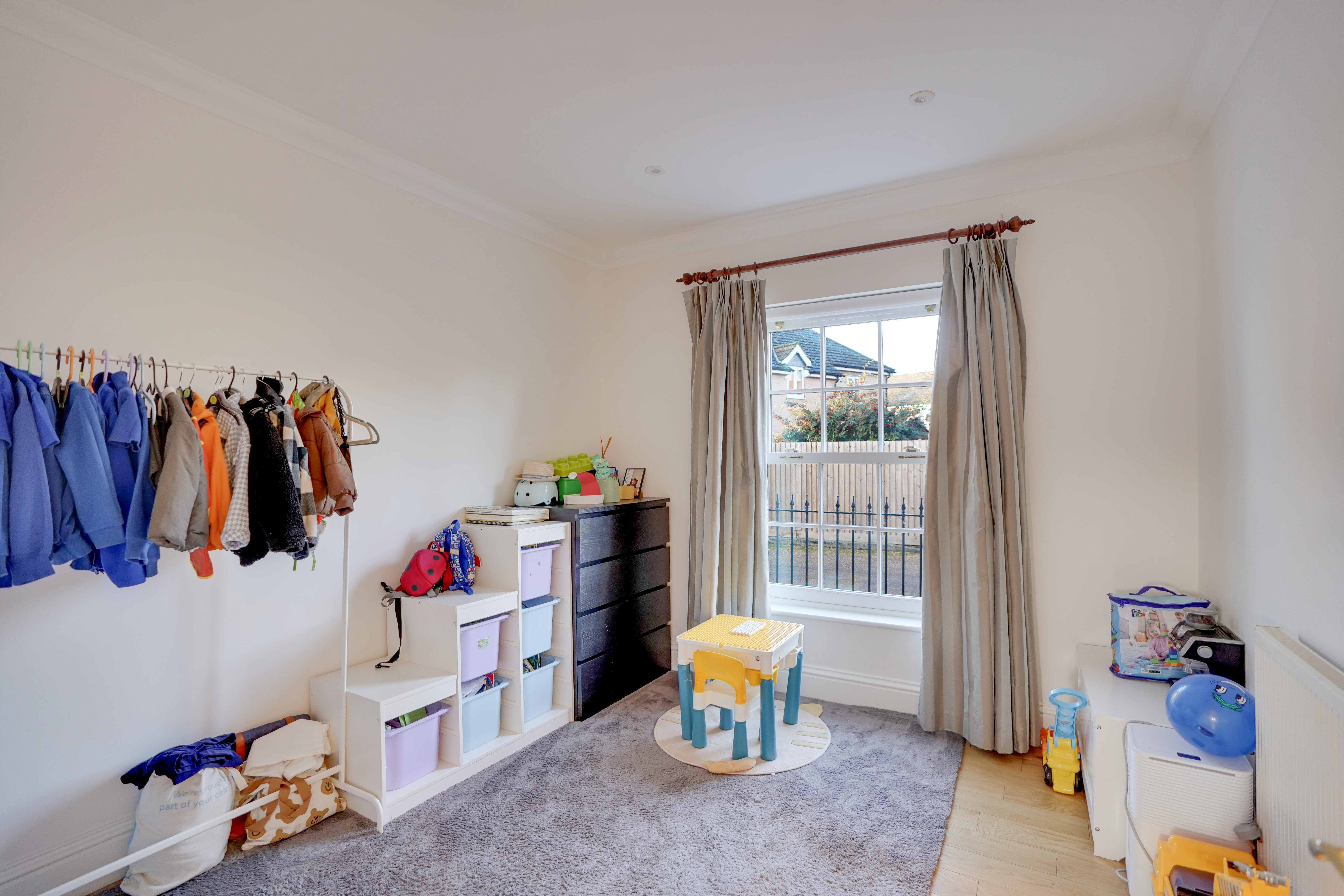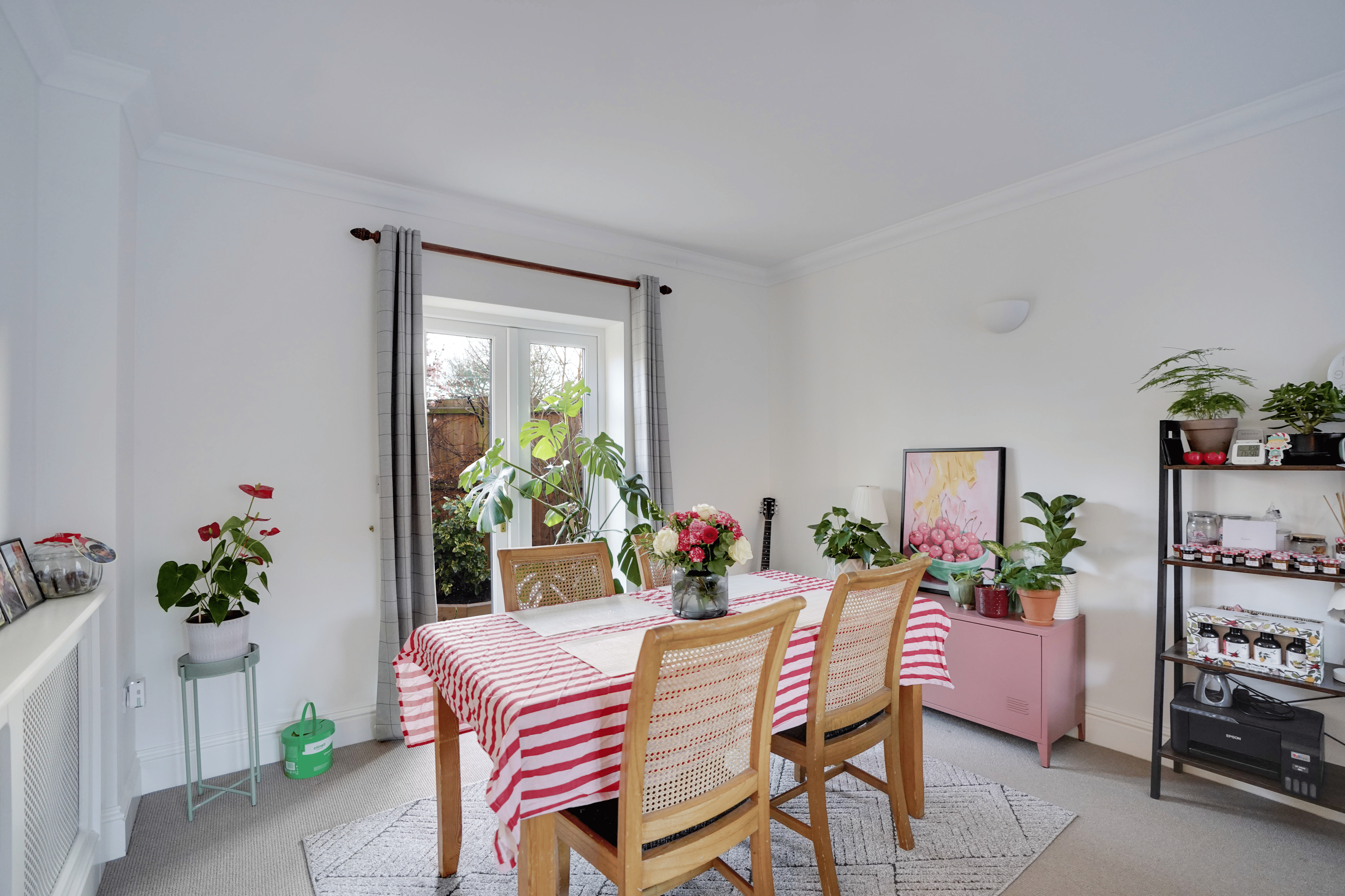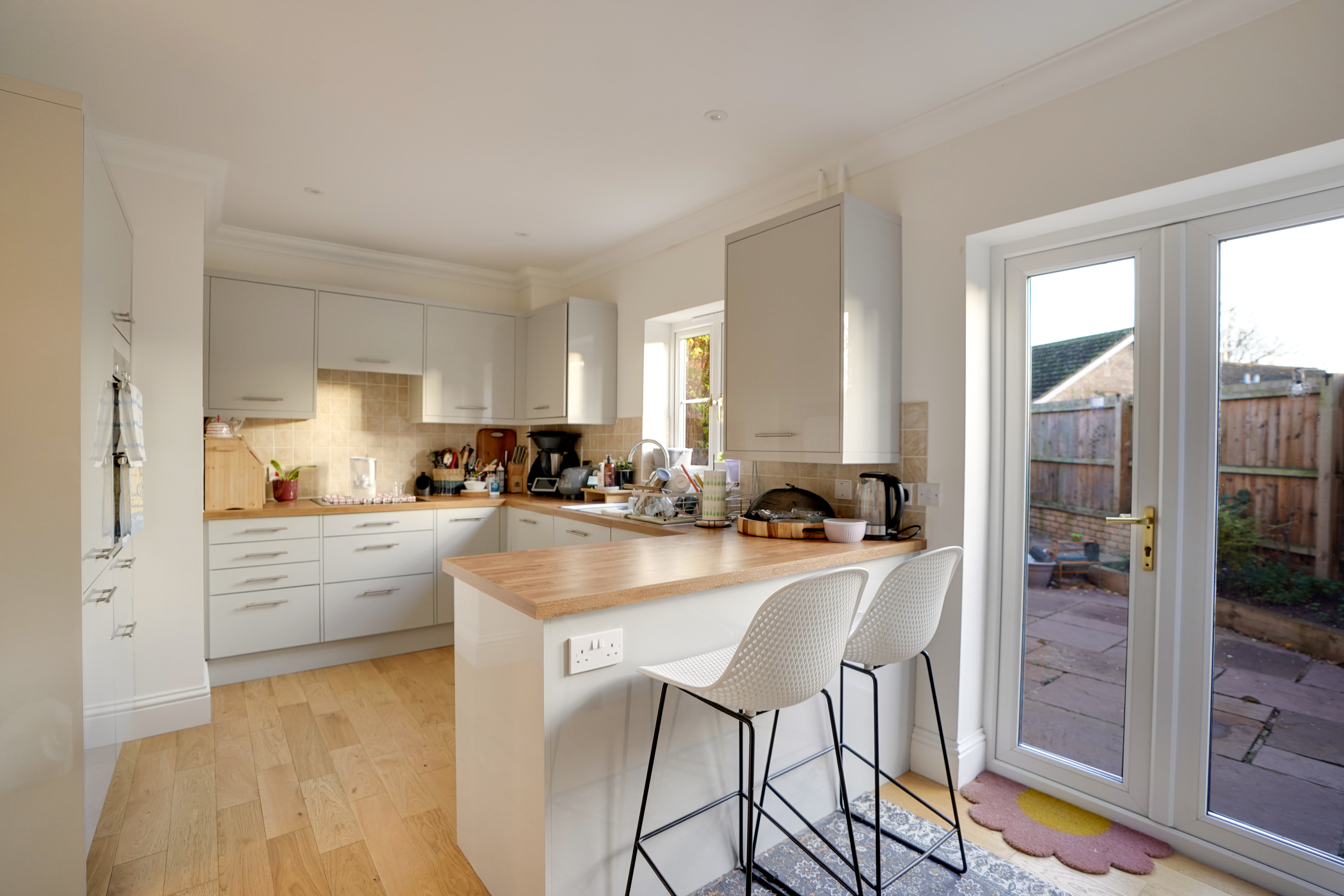 To the right of the hallway is the dining room, overlooking the front of the property. This versatile space comfortably accommodates a table for 4–6 people and could alternatively be used as a home office or children’s playroom. Opposite, the kitchen/breakfast room is fitted with modern grey wall and base units and includes an electric oven with microwave above, stainless steel sink and drainer, full-height fridge freezer, and a breakfast bar seating two. The dining area comfortably fits a table for four and benefits from French doors opening onto the rear garden.