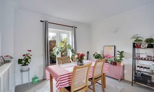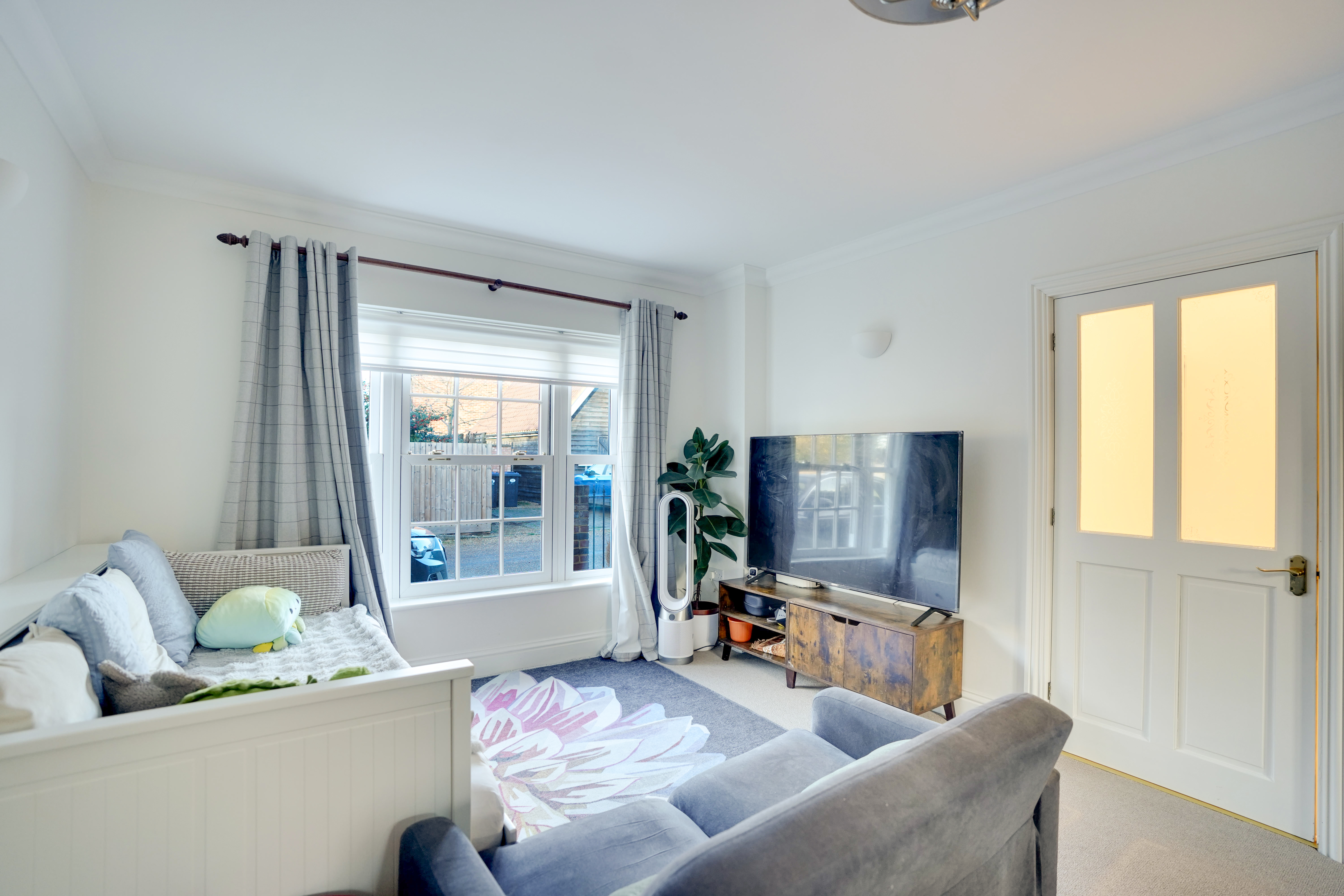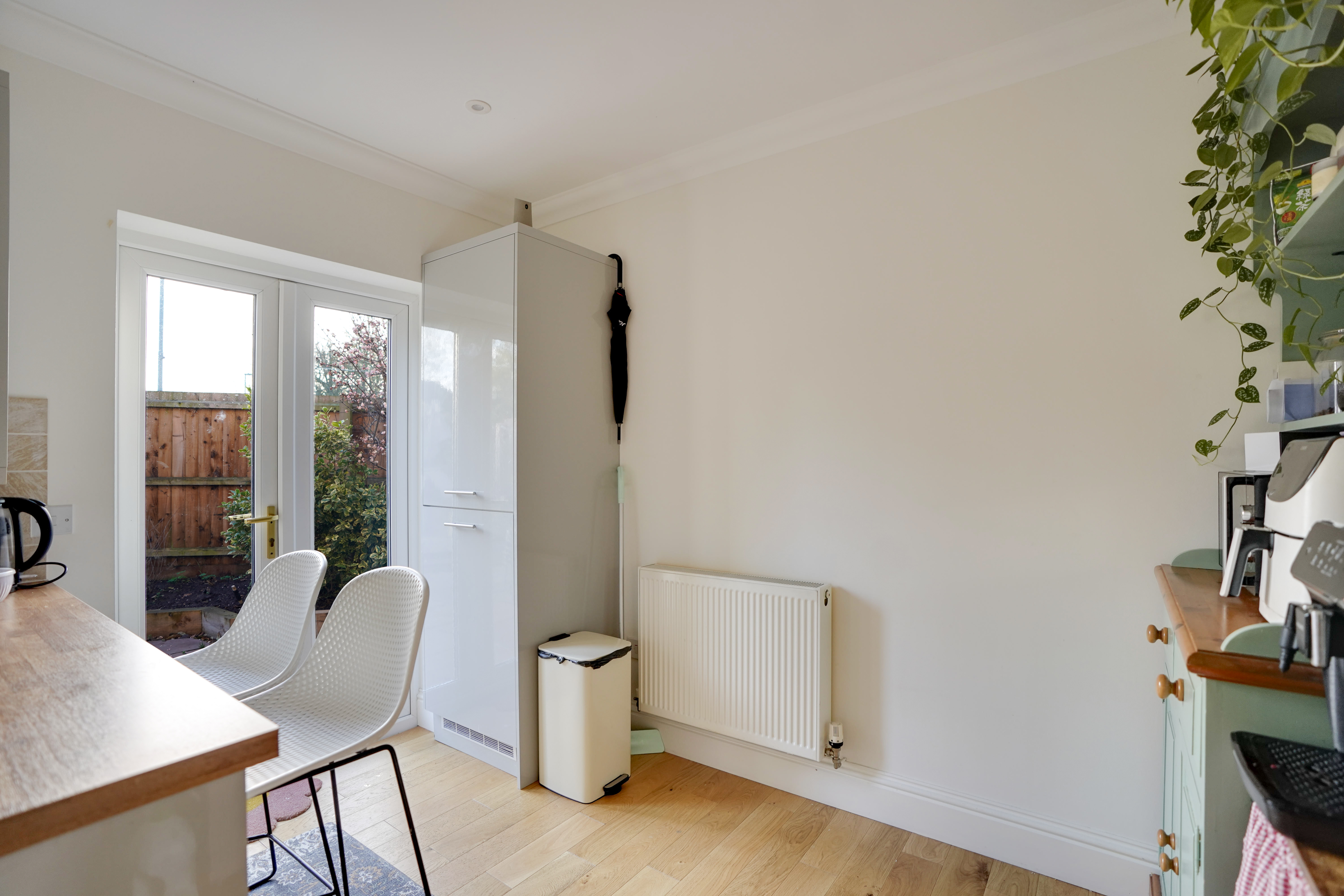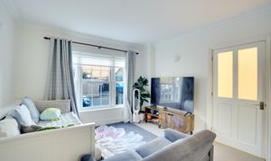At the end of the hallway is the spacious living room, spanning the full length of the property. This bright and airy room enjoys dual-aspect views, with a window to the front and French doors to the rear garden, complemented by wall uplighters and an elegant chandelier-style ceiling light.