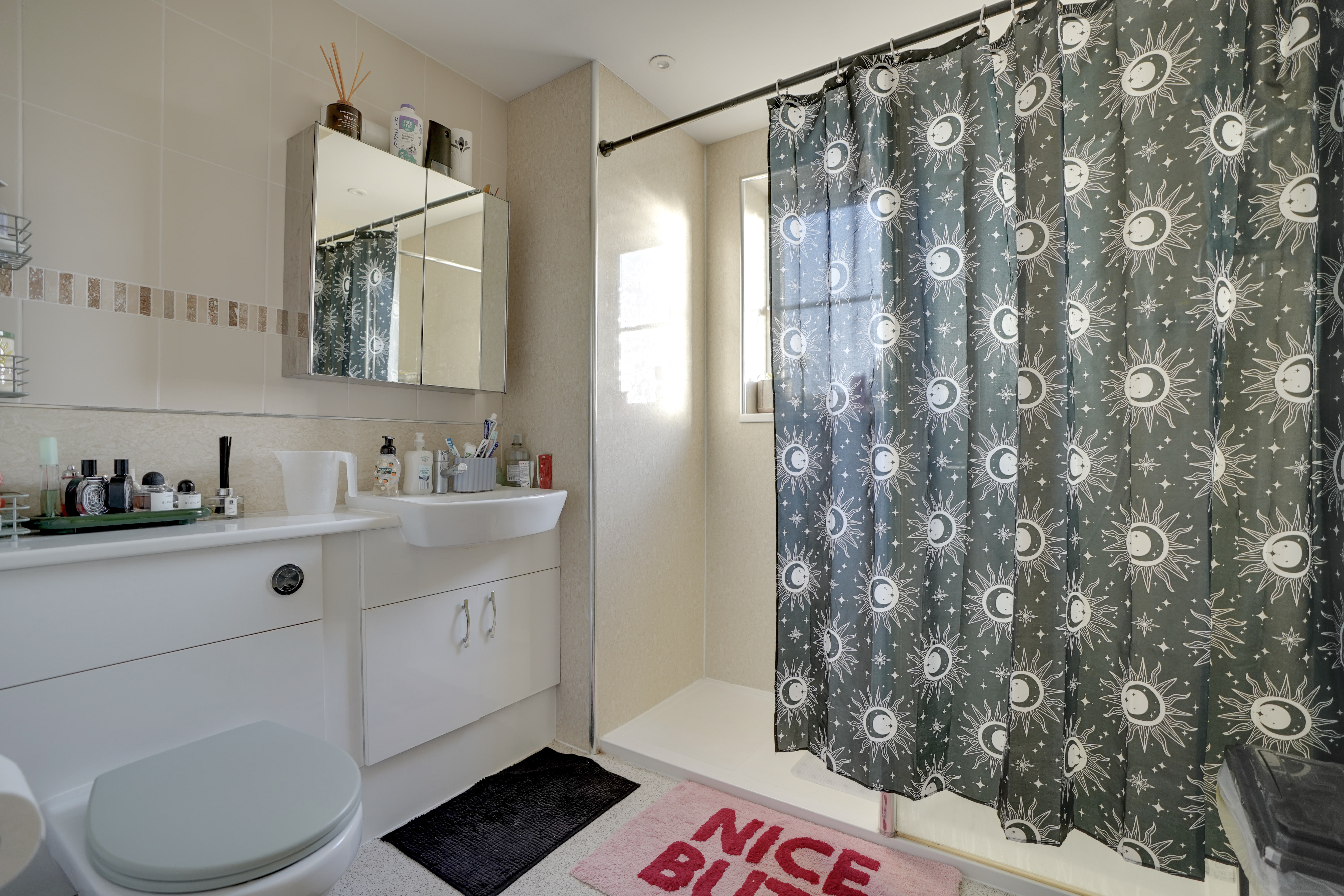 The first floor offers four well-proportioned bedrooms, an en-suite to the principal bedroom, and a family bathroom. The master bedroom overlooks the front and features two double built-in wardrobes. The adjoining en-suite is finished with floor-to-ceiling neutral tiles and includes a walk-in shower with glass bi-fold door, W.C., hand basin, and mirrored storage cupboard. Opposite is the family bathroom, comprising a vanity unit with W.C., countertop hand basin, storage below, and a large walk-in shower with glass screen.