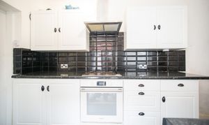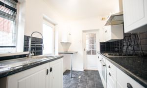 With vinyl flooring, sink/drainer, laminate work surfaces, space for appliances, hob, oven, extractor fan and door leading to the rear yard.