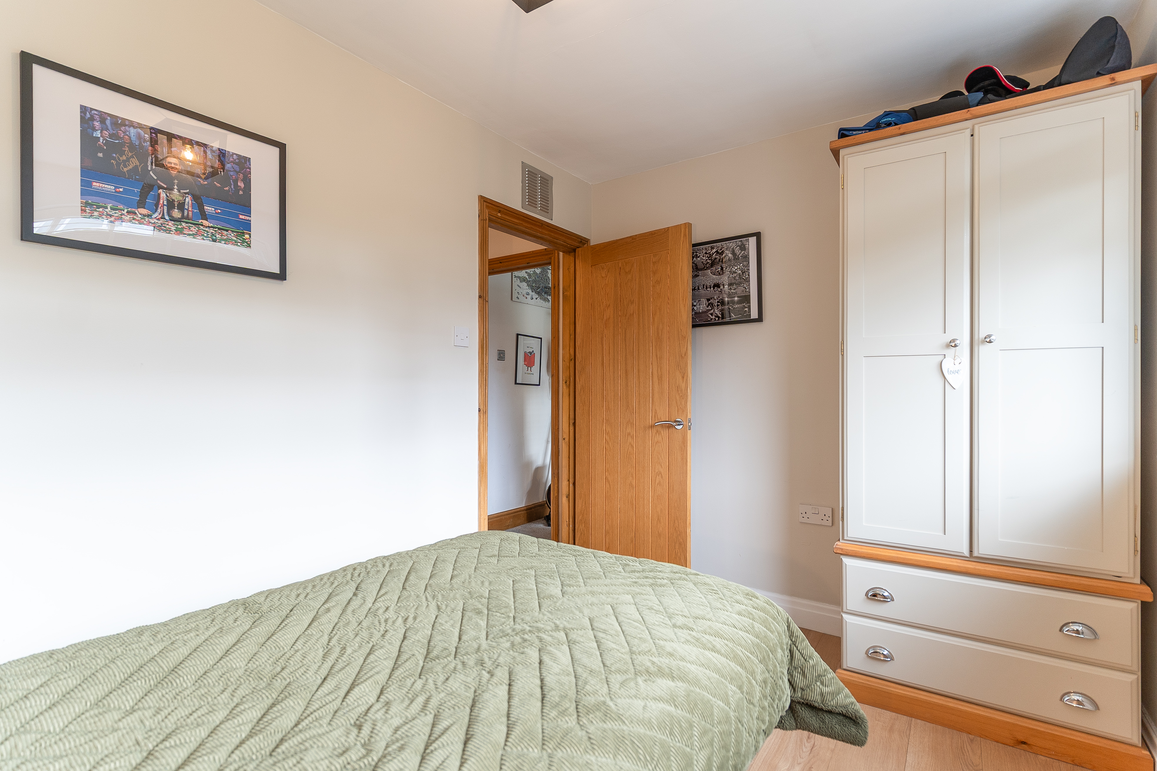 Stairs lead down to the lower level, where you’ll find a shower room, utility area, and integral access to storage and garage space. This floor also features a large double bedroom with built-in storage and access to a study, offering flexibility for use as a private guest suite, home office, or teenage retreat.
