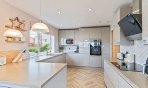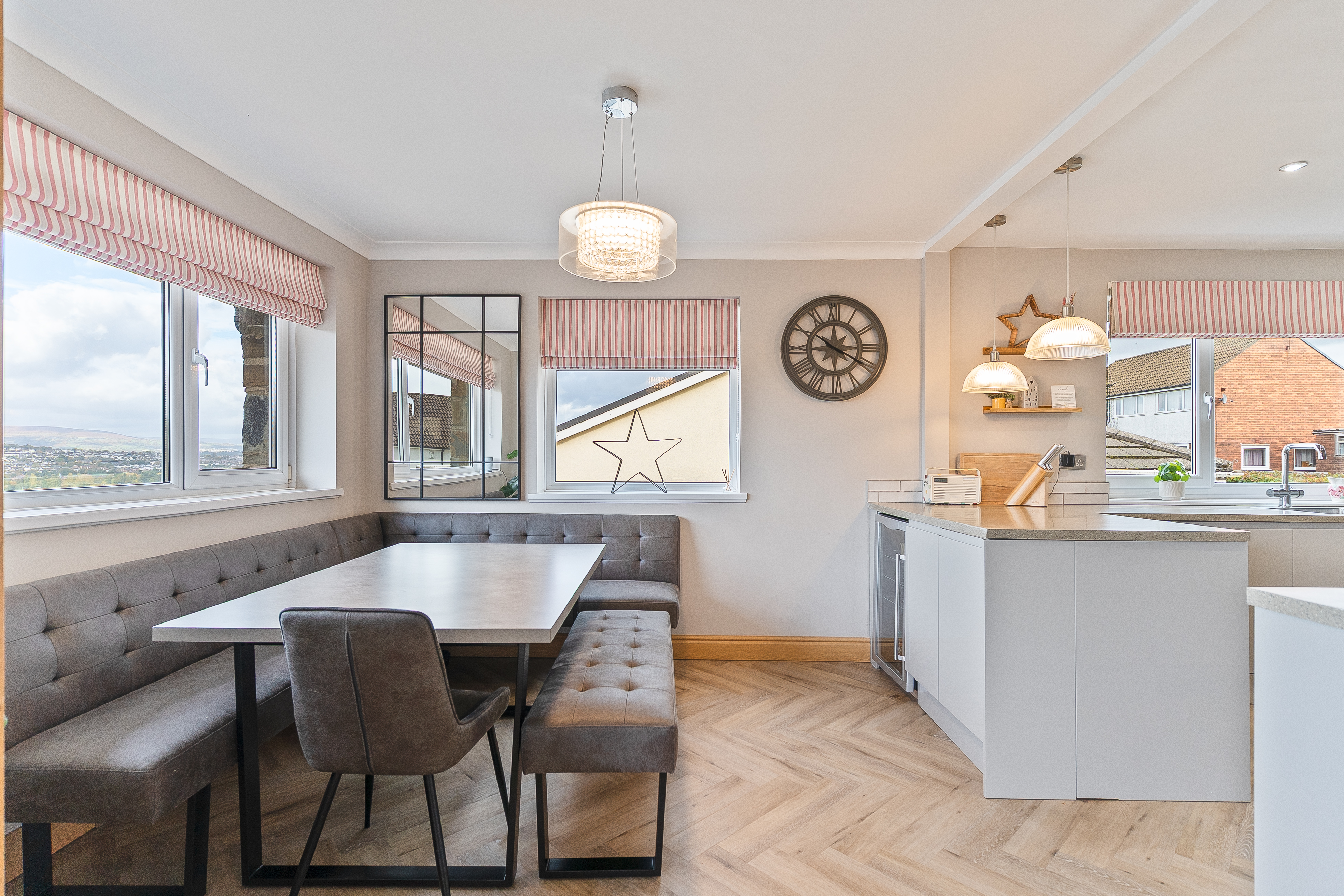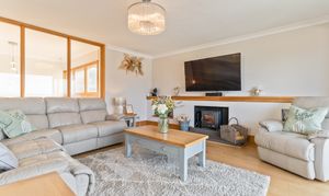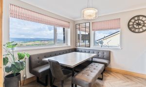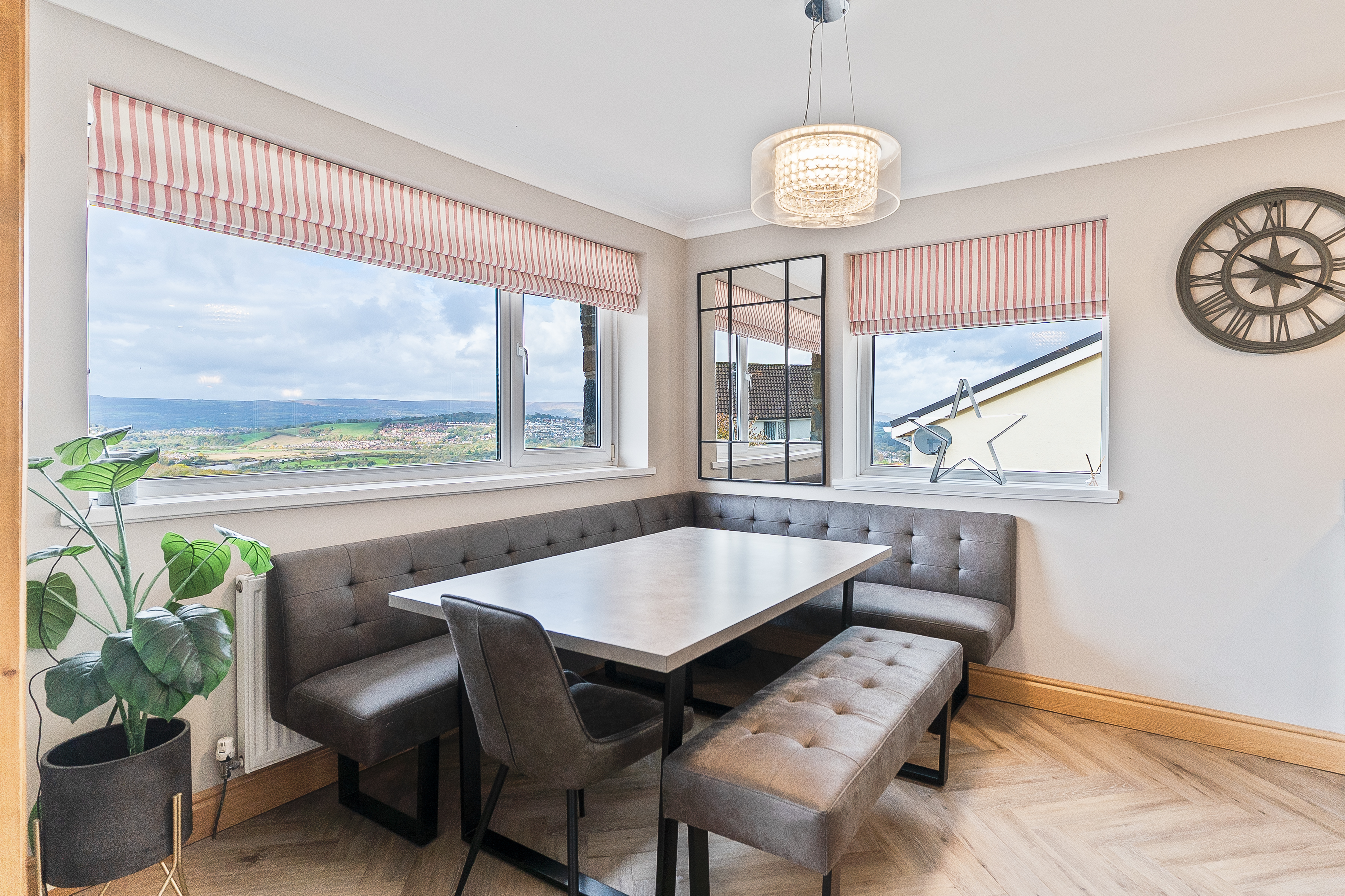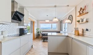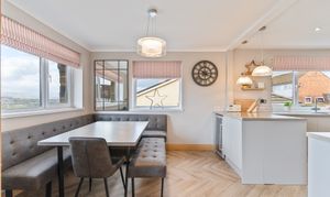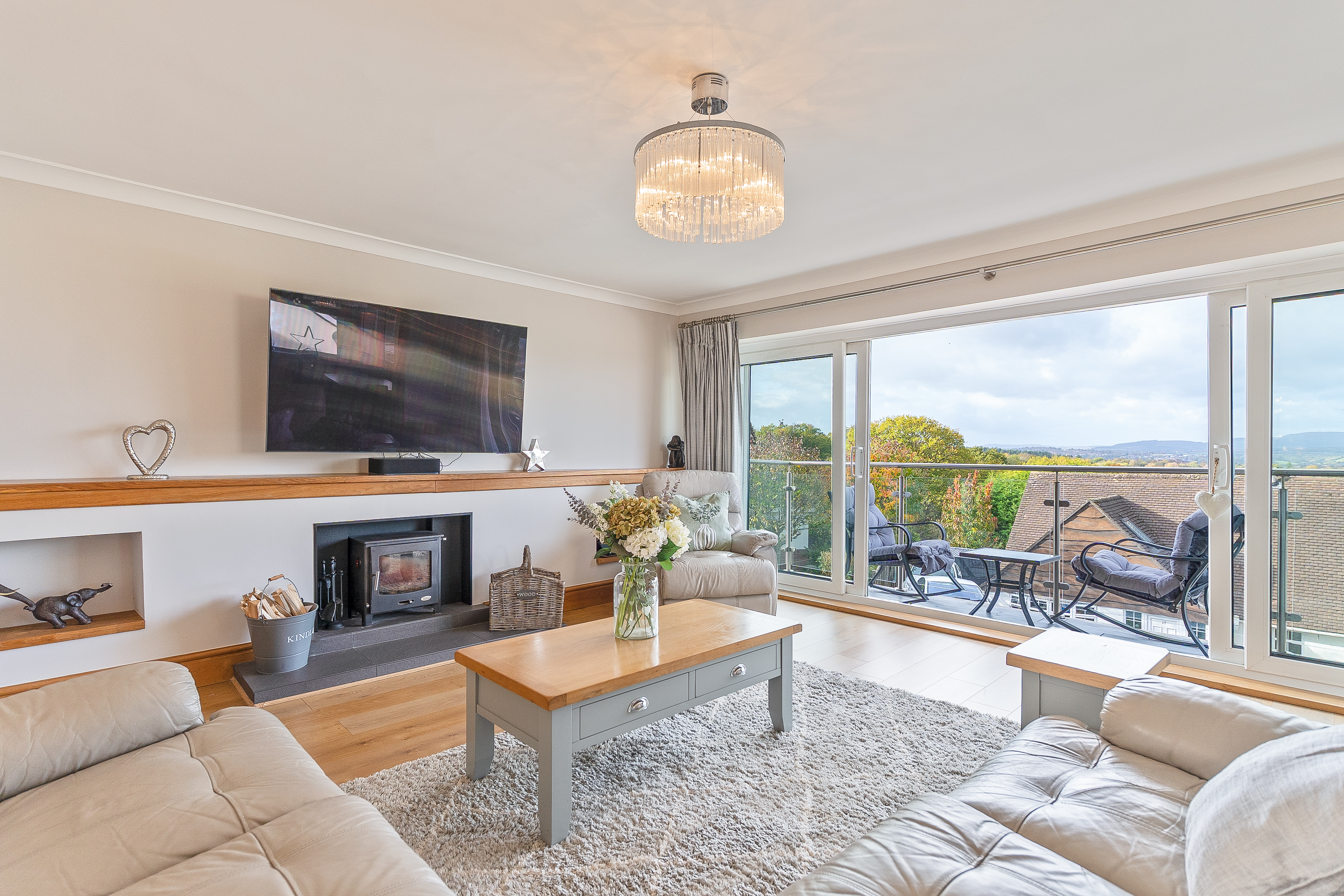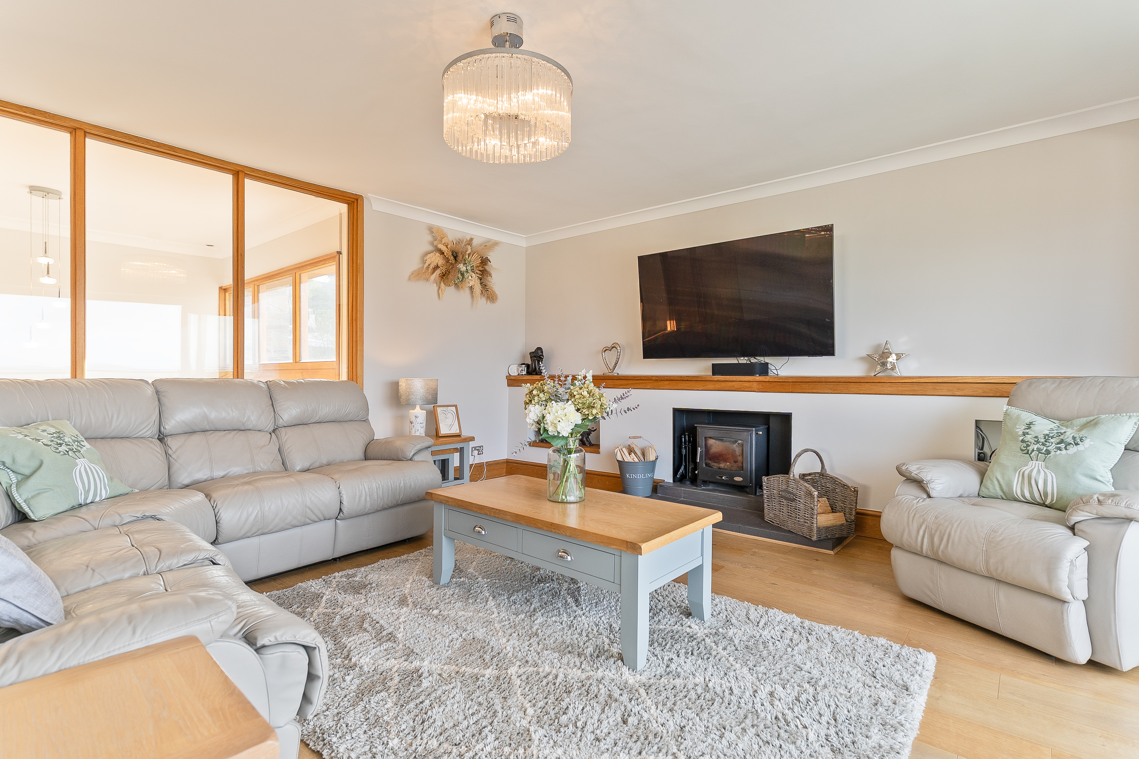 The main living area occupies the upper floor, designed to make the most of the spectacular views. The spacious lounge features large sliding doors and windows that open onto the balcony, providing an incredible outlook across the valley - perfect for relaxing or entertaining. The open-plan layout seamlessly connects to the modern kitchen/diner, creating a bright and sociable space ideal for family life. The kitchen is fitted with a range of contemporary units, ample storage and worktop space, and room for both seating and dining, making it a truly versatile area for cooking and entertaining.