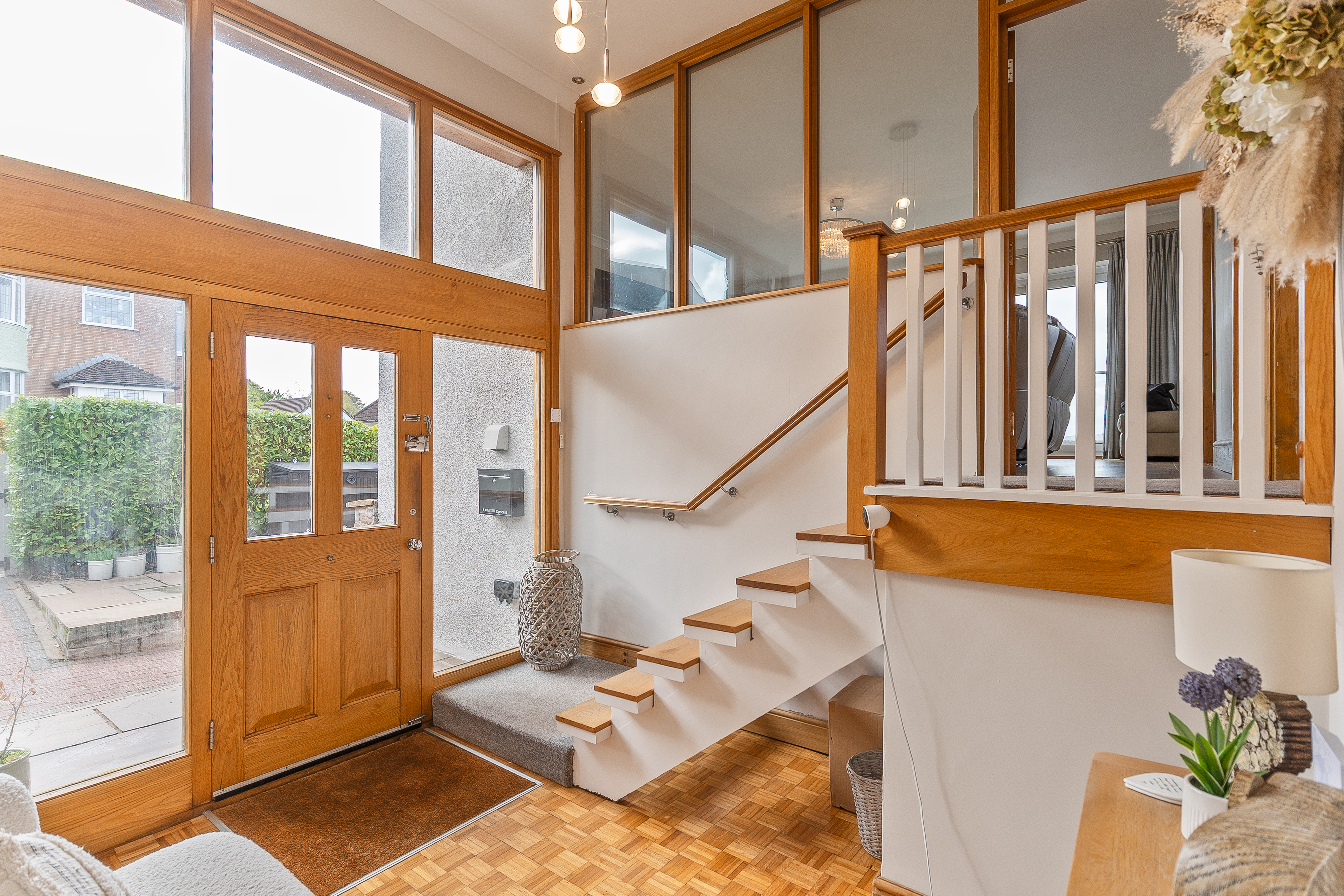 You enter the property through an inviting entrance hall, featuring large windows that flood the space with natural light. From here, you have access to the bedrooms and bathroom, while stairs to the left lead up to the main living areas.