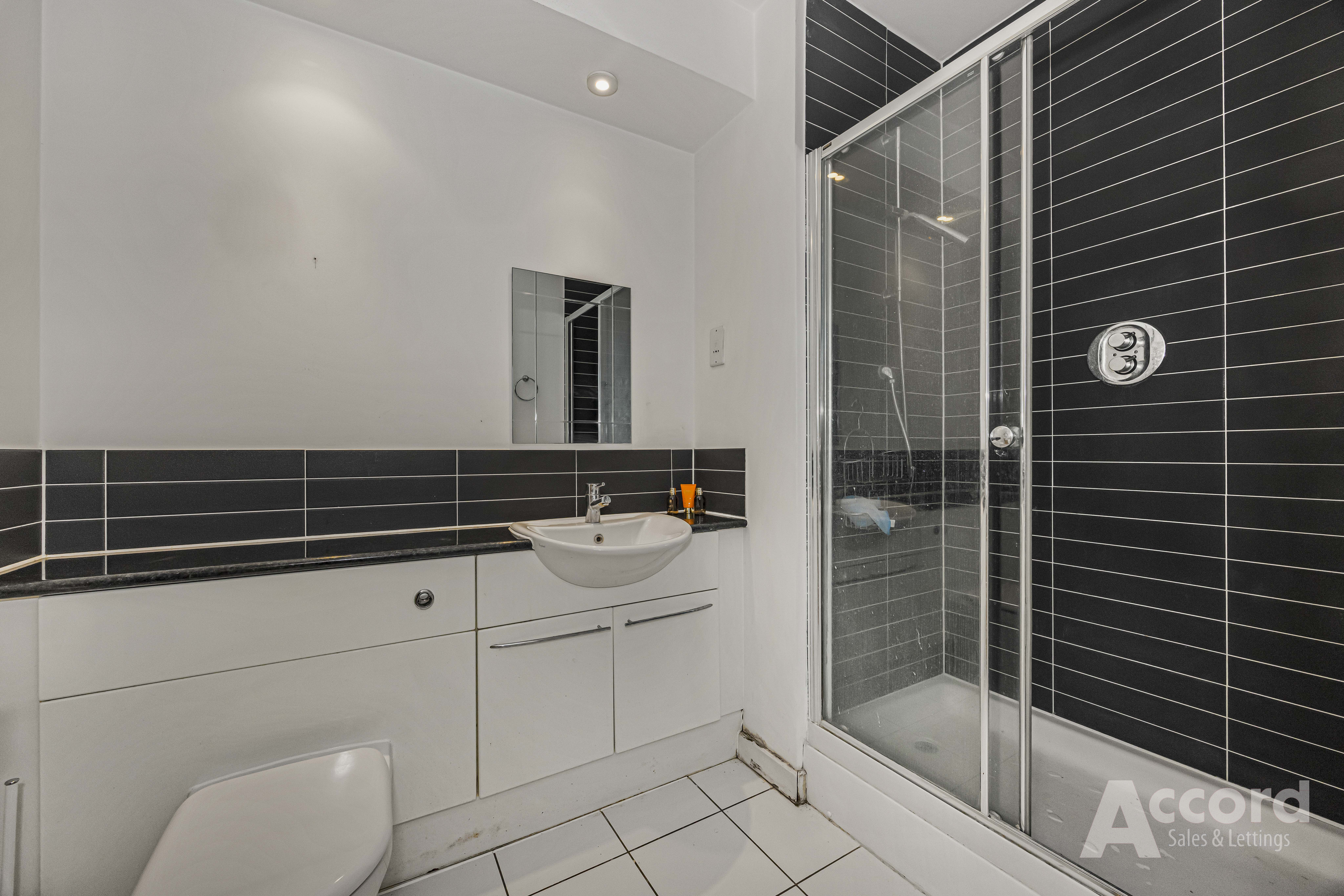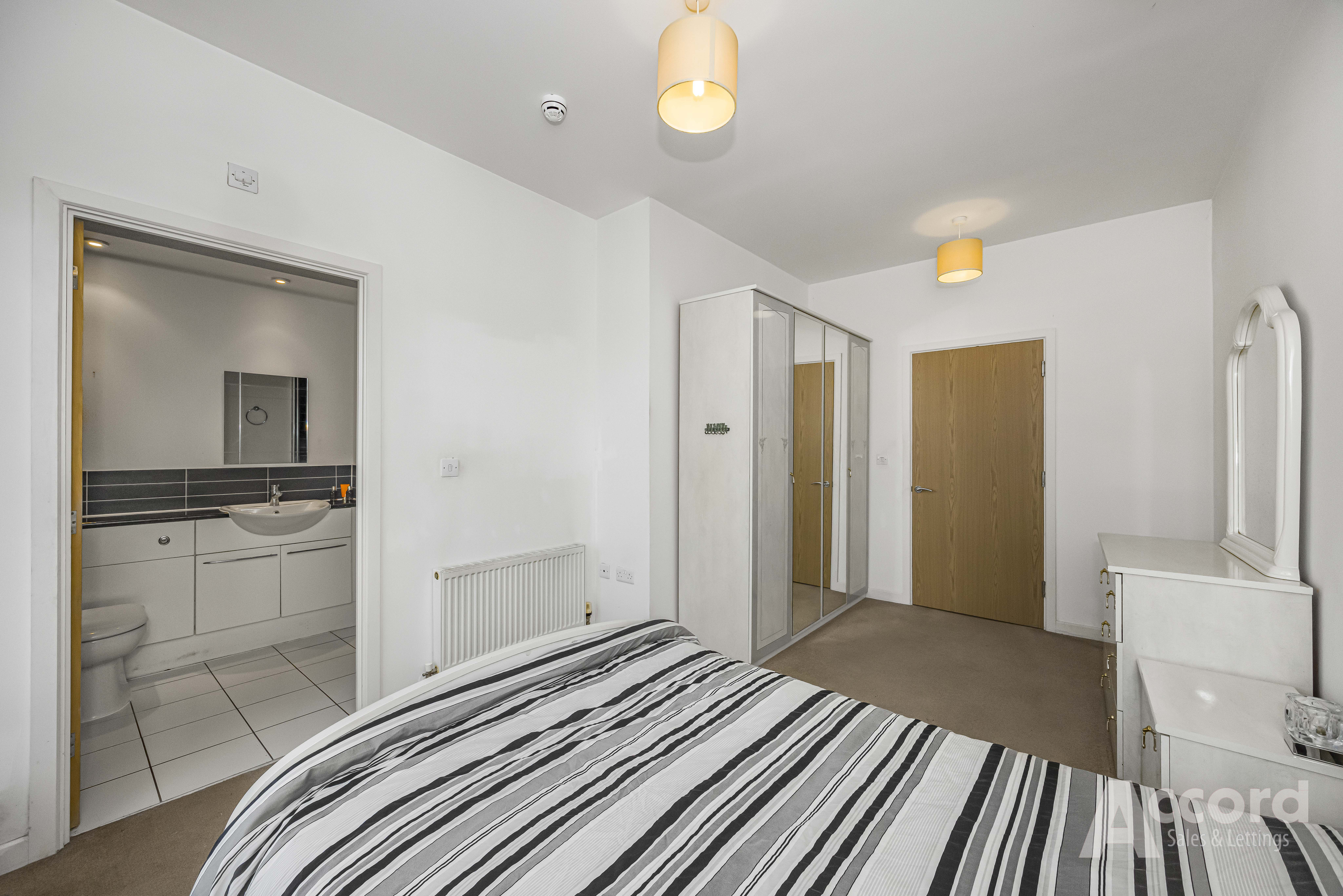 Both bedrooms are comfortable doubles. The main bedroom has built-in wardrobes and its own en suite shower room with contemporary tiling and fitted storage. The second bedroom also has fitted wardrobes and is served by the main bathroom, again with a modern white suite and good storage.