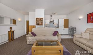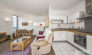 Inside, the apartment feels open and airy, with a generously sized open plan kitchen, living and dining room. Large windows draw in the light and open directly onto the roof terrace, making it a great space for relaxing or entertaining. The kitchen area is fitted with modern white units and integrated appliances, and there is plenty of room for a dining table as well as generous seating.