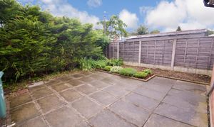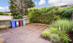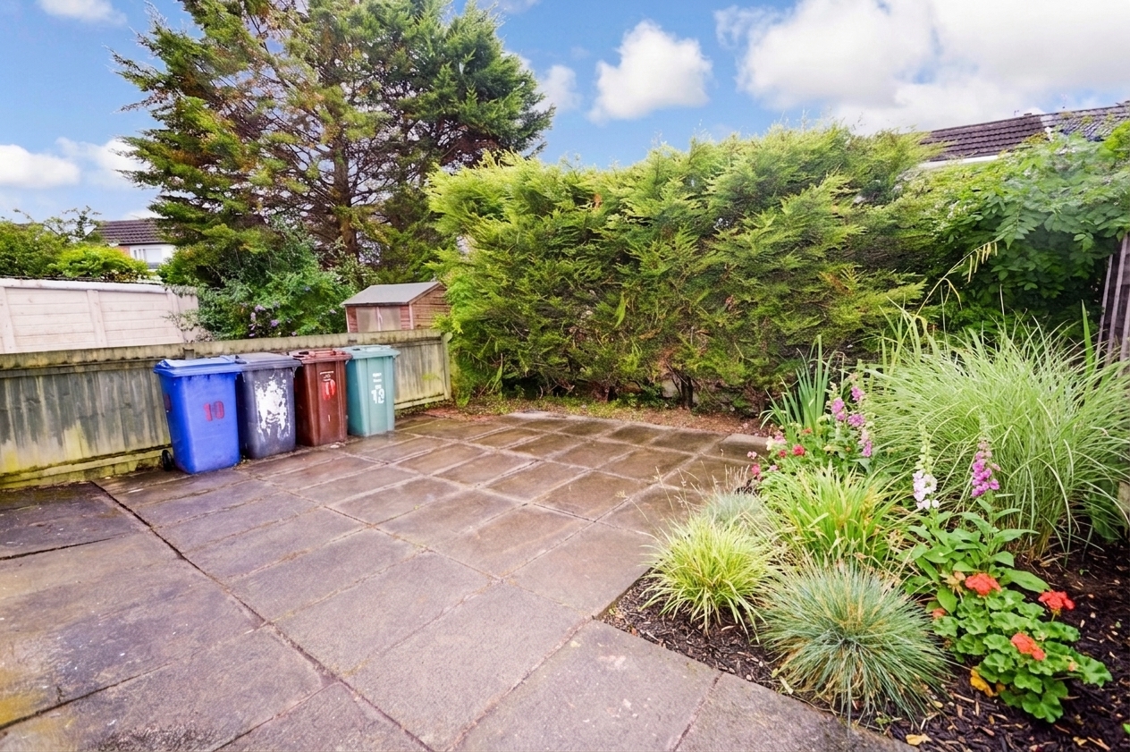 Externally, the property features a driveway to the front and a side access leading to the rear garden. The rear garden is paved for low maintenance and includes flowering shrubs along the rear border.