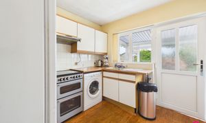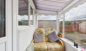 Entered via a front porch, this well kept bungalow offers practical lateral living, with essential accommodation arranged on one level. The living room is a bright and welcoming space, comfortably sized for lounge furniture and centred around a feature fireplace, with a large window allowing in plenty of natural light. The kitchen is fitted with a range of wall and base units, providing useful storage and worktop space, and includes a sink unit, plumbing point for a washing machine, space for further appliances and a freestanding oven. The bedrooms are well proportioned, with the main bedroom enjoying a pleasant rear outlook and room for further furniture, while the second bedroom offers flexibility as a guest room, dressing room or study. The bathroom is arranged as a wet room and includes a level access shower, designed with practicality and ease of use in mind. To the rear, a sun room provides an additional seating area overlooking the garden.