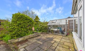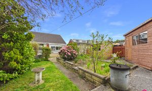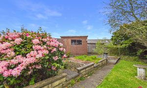 Externally, the property enjoys a generous corner style plot with gardens to the front, side and rear, offering plenty of outside space to enjoy. To the front, there is a lawned garden with planted borders alongside a driveway providing off road parking. A ramped approach leads to the front door, supporting step-free access from the street and making entry into the bungalow straightforward and practical. To the rear, the garden combines paved patio areas, planted beds, established shrubs and a lawned section, creating a pleasant outdoor space with scope for seating, pottering or entertaining. A sun room extends off the rear of the property and looks out over the garden, adding to the connection between indoors and out. The plot also benefits from useful outbuildings, including a timber shed, while gated side access adds further convenience.