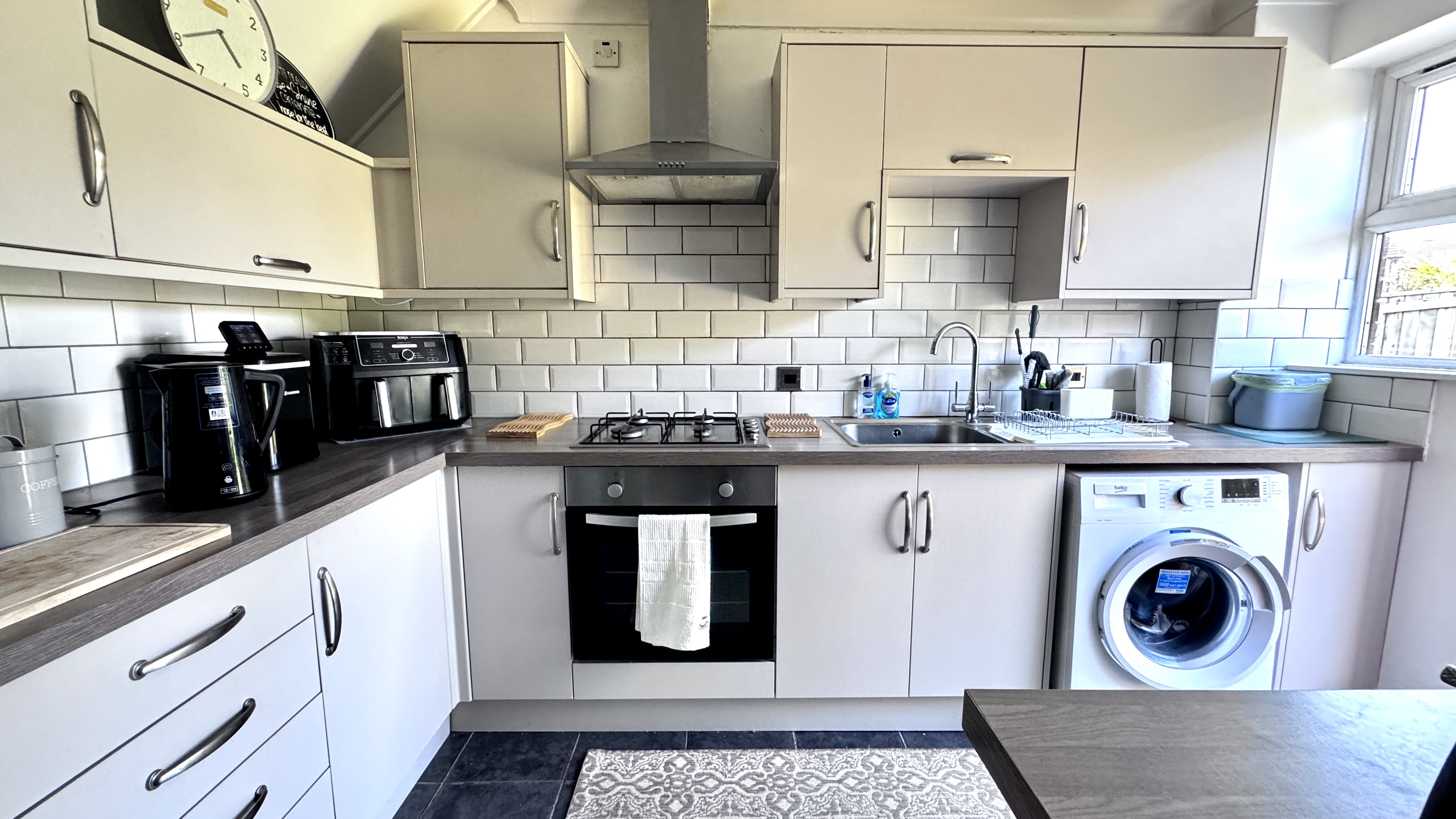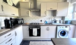 The kitchen is fitted with a range of modern grey wall and base units, complemented by contrasting grey worktops. It is equipped with an electric oven, gas hob and extractor, stainless steel sink with drainer and mixer tap, and stylish white brick-effect tiled splashbacks. There is space and plumbing for a washing machine, as well as space for a fridge and freezer. A door leads directly out to the rear garden.
