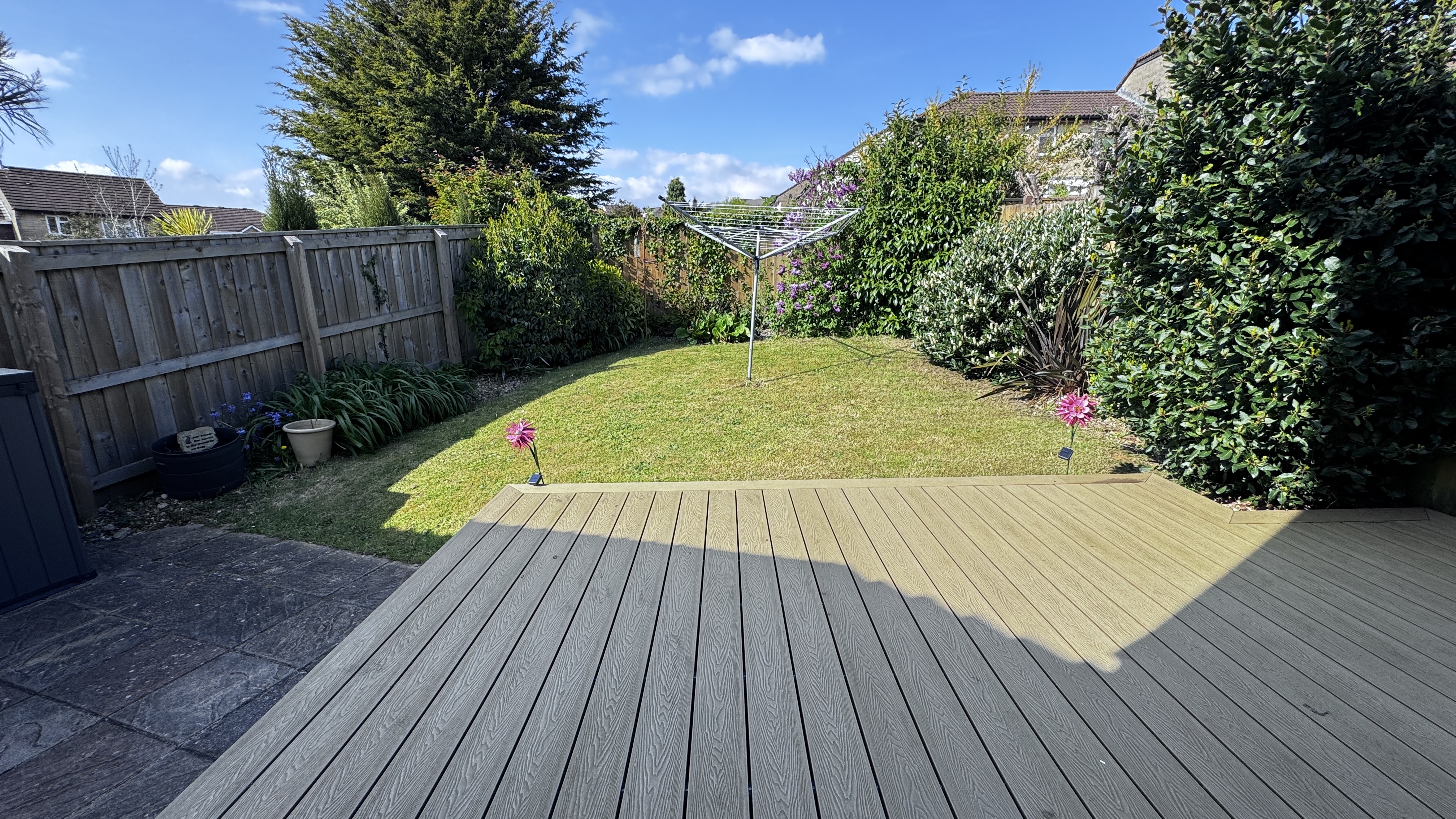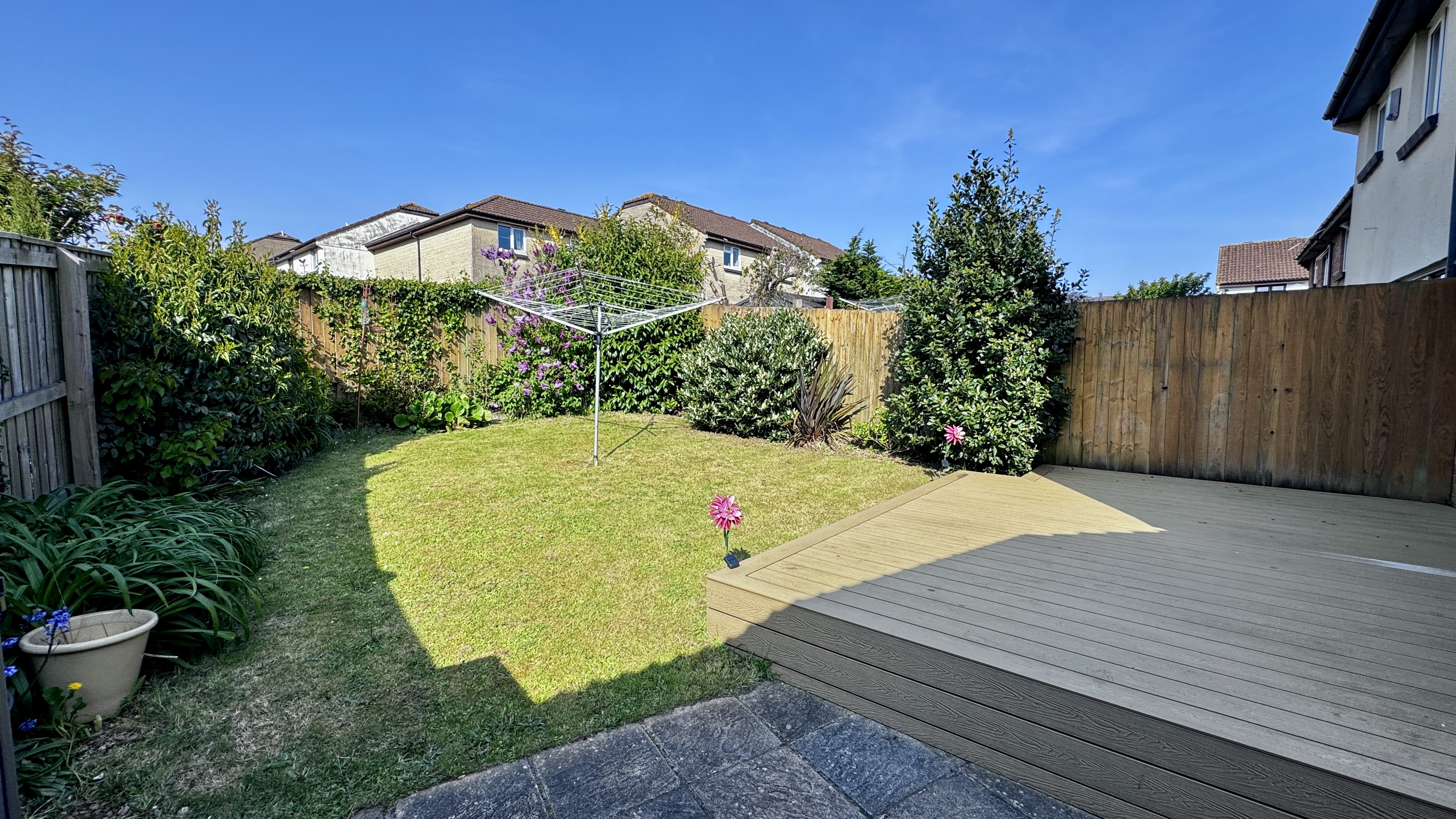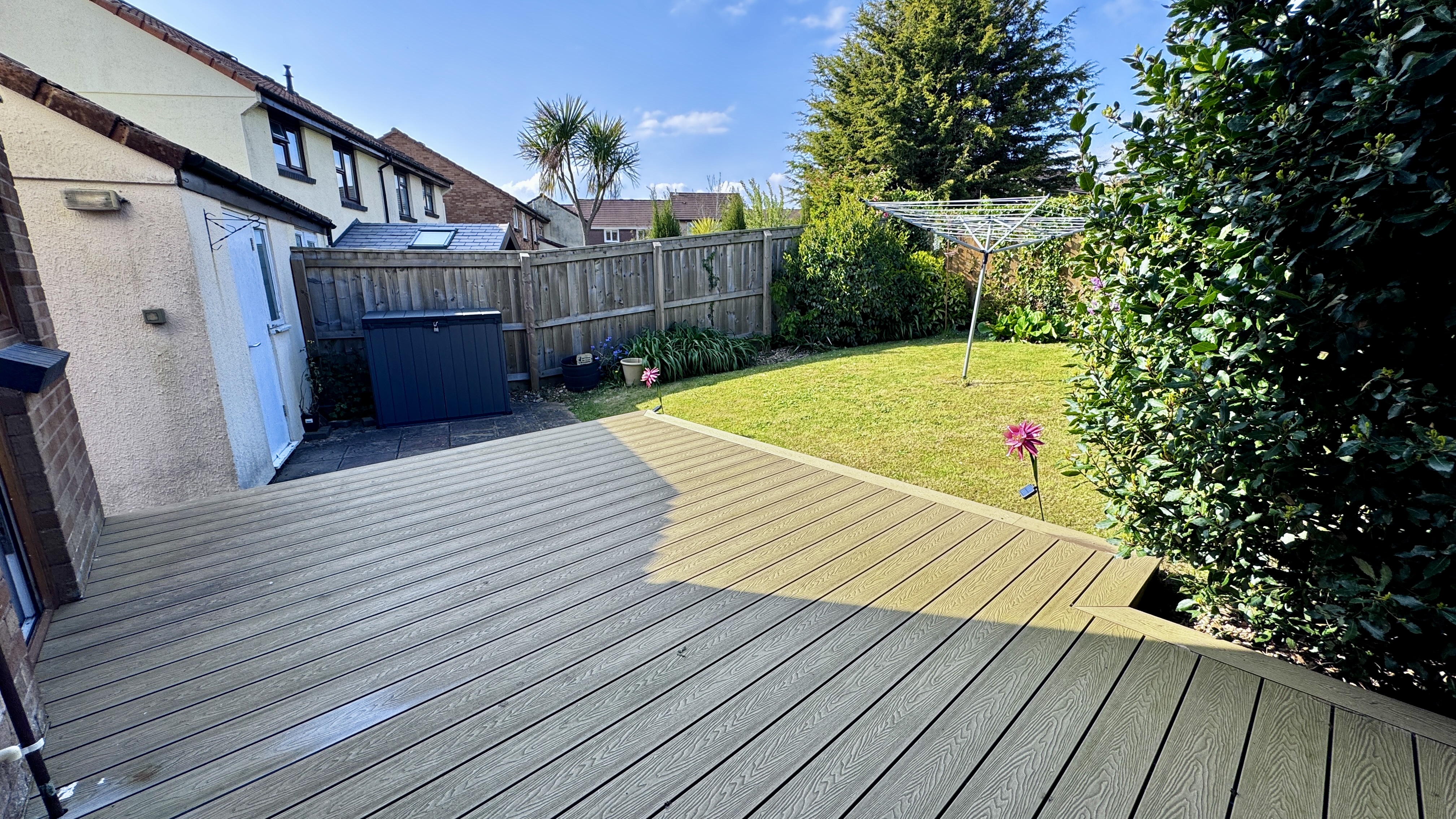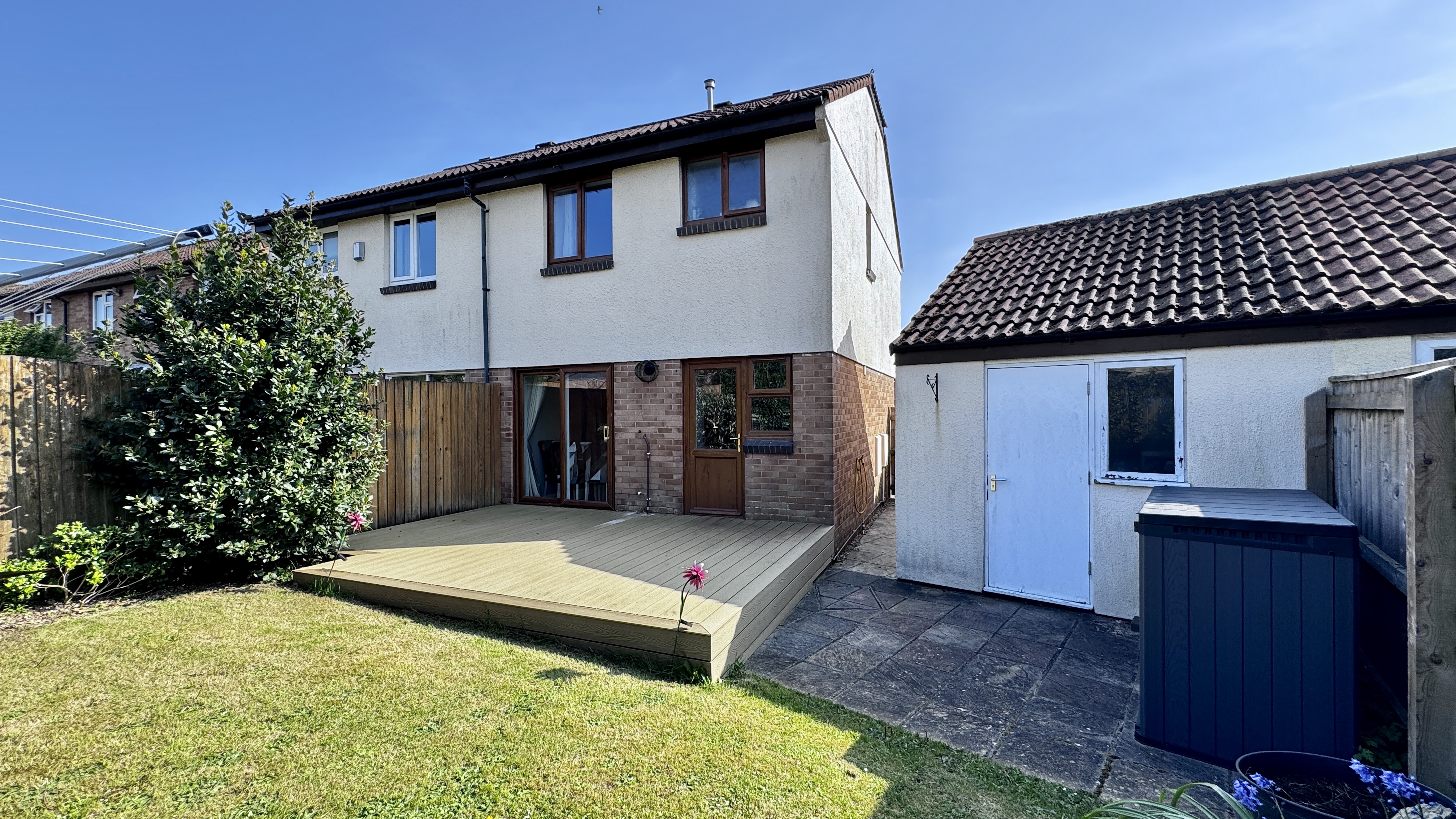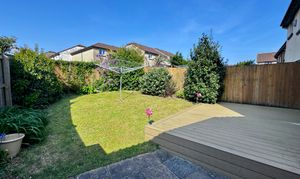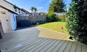 Externally, the rear garden is fully enclosed by timber fencing, providing a safe and private outdoor space. It features a combination of composite decking, patio slabs, and lawn, bordered by established flowerbeds. There is a gate providing access to the front of the property, as well as a door leading into the rear of the detached garage.