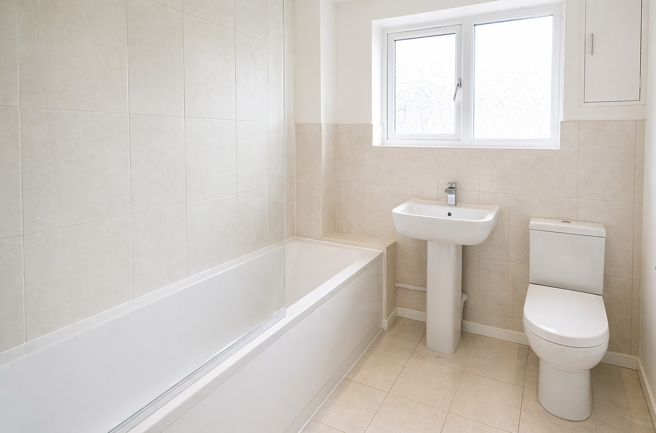 Upstairs, the property offers two well-proportioned double bedrooms and a single bedroom, ideal for a child’s room, guest space, or home office. The family bathroom comprises a white suite including a bath with shower over, low-level WC, and wash hand basin, along with an obscure window to the rear for privacy and natural light.