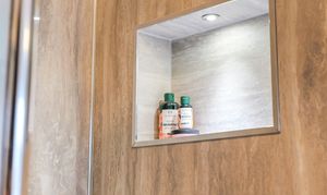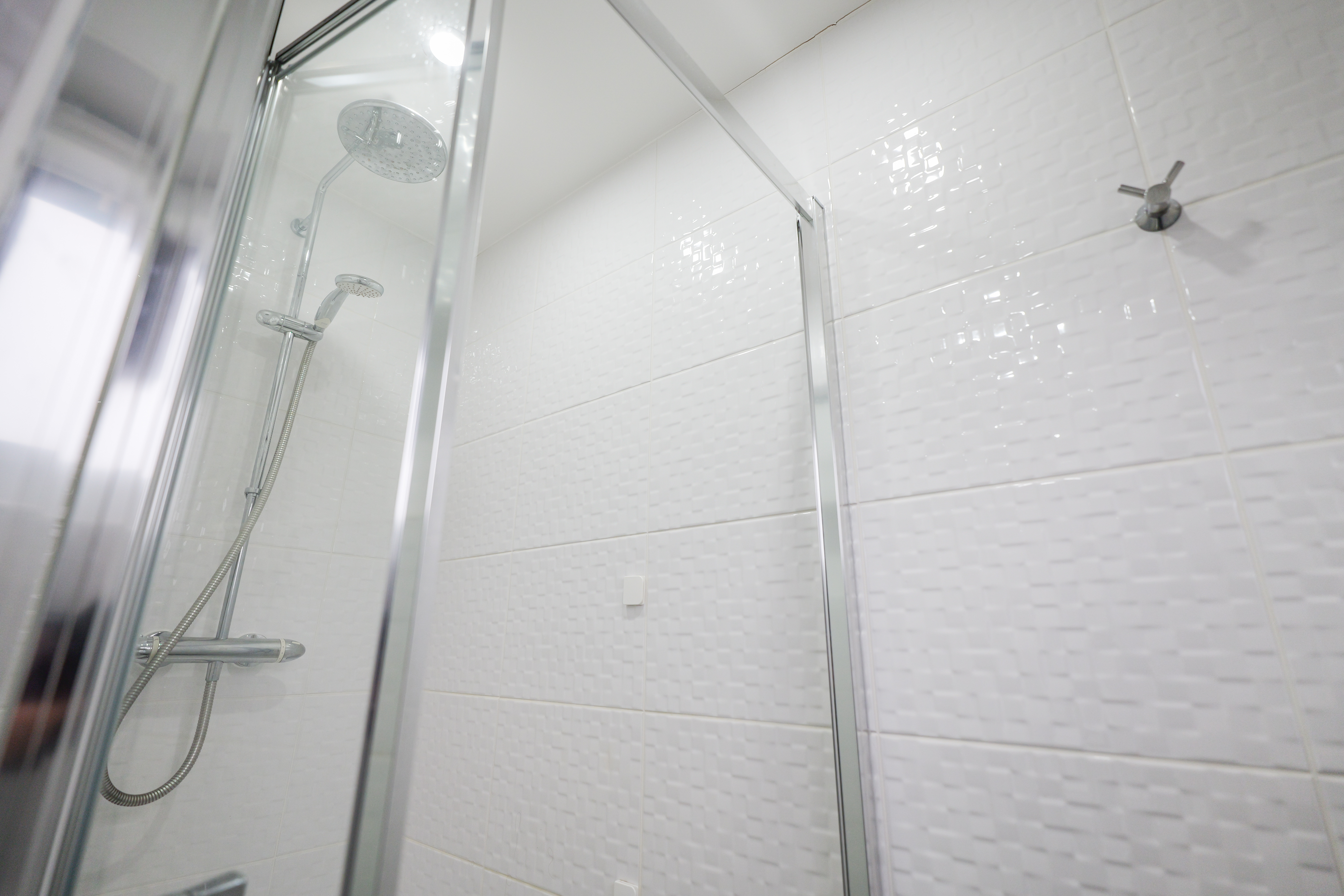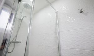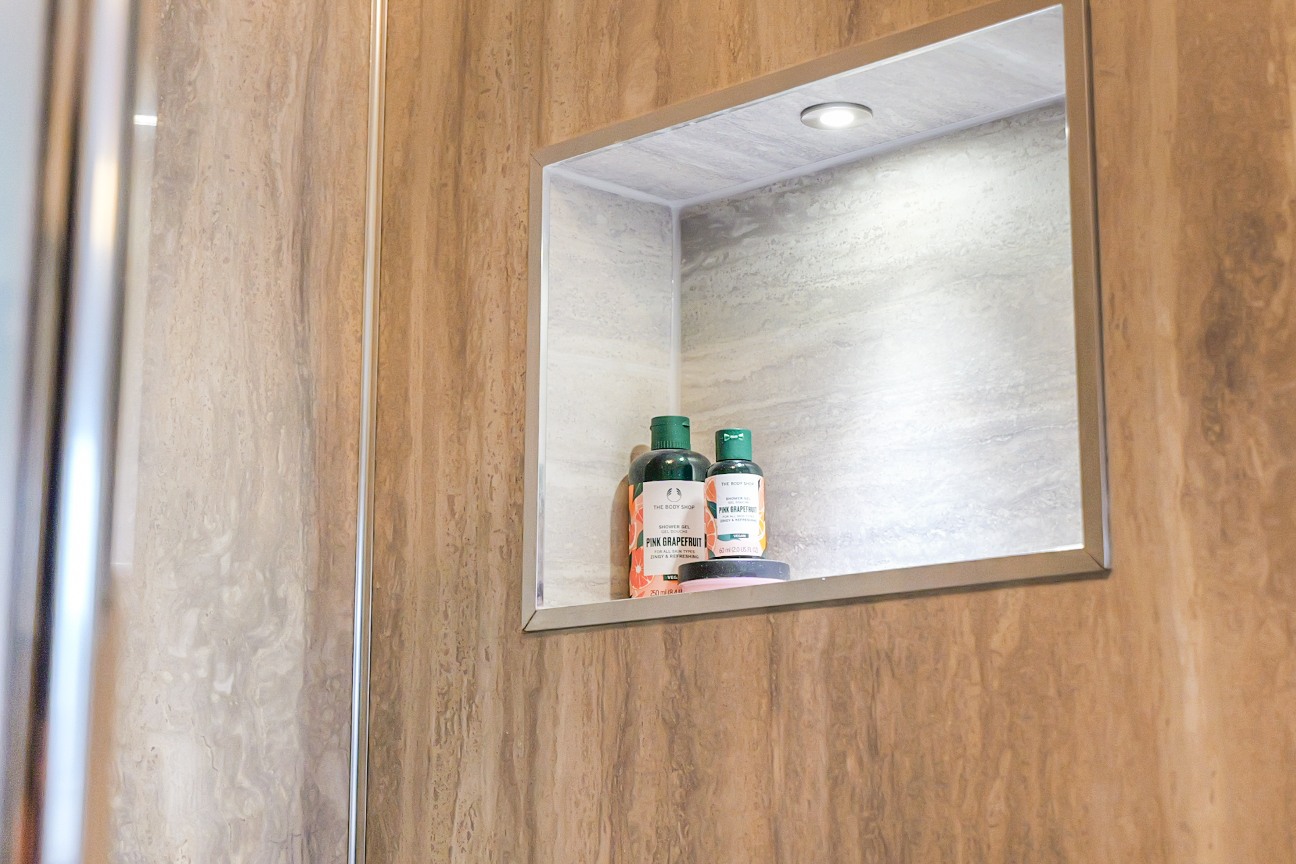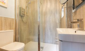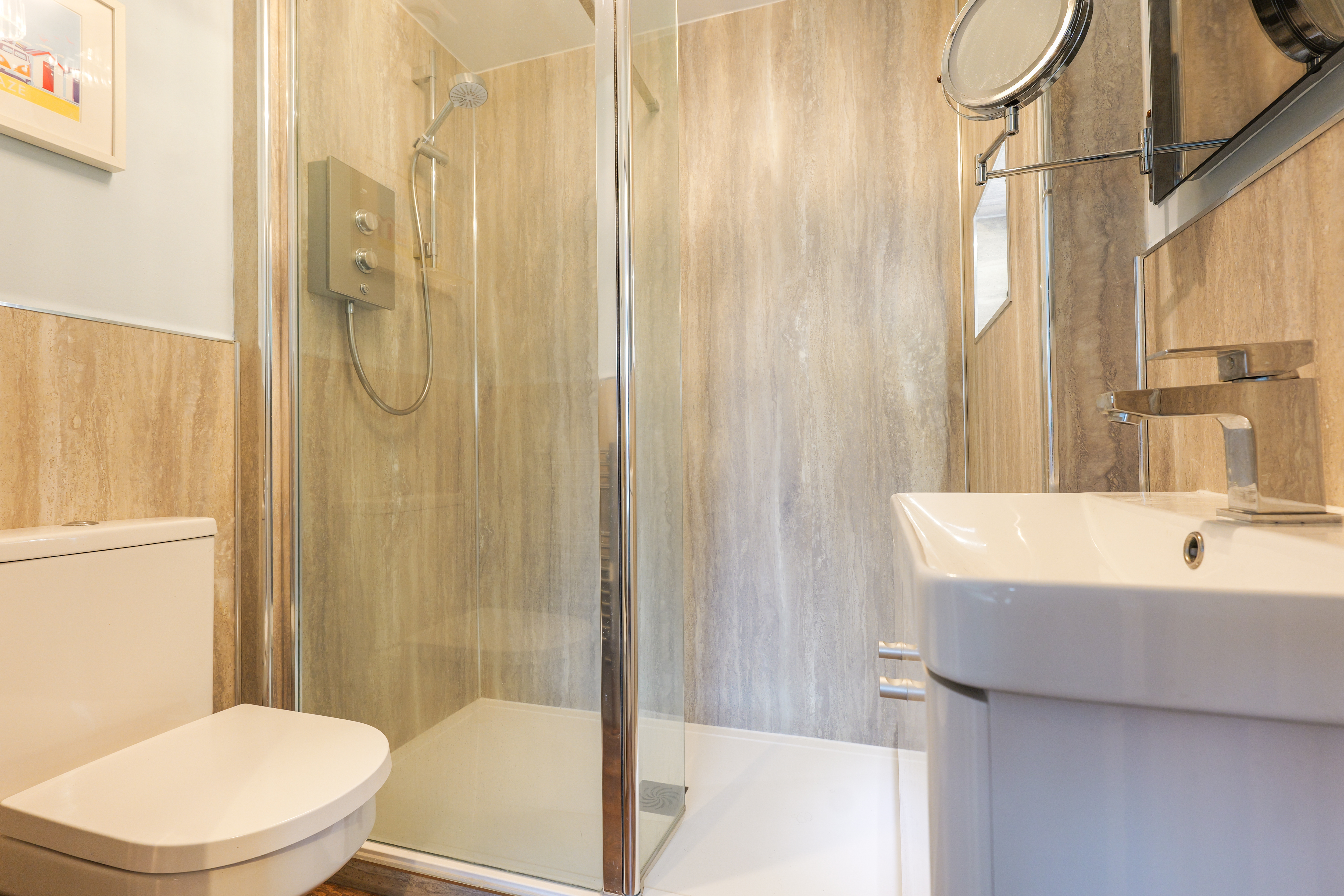 The contemporary en-suite boasts a spacious double shower enclosure with a recessed shelf, perfectly designed for both style and convenience. The wash hand basin is encompassed within a sleek vanity unit with a dual flush Wc adding efficiency, while stylish wet wall panelling creates a luxurious atmosphere.
